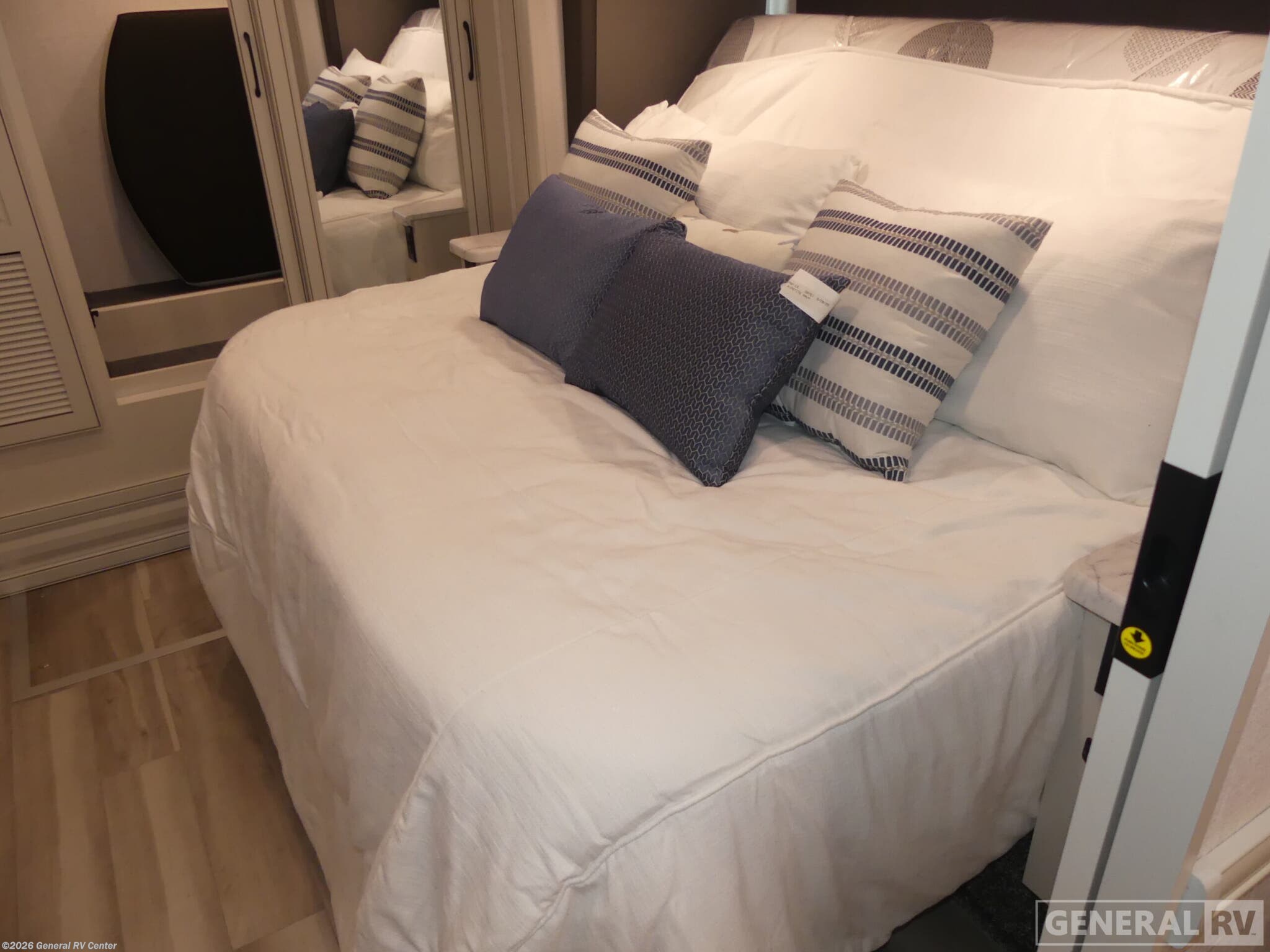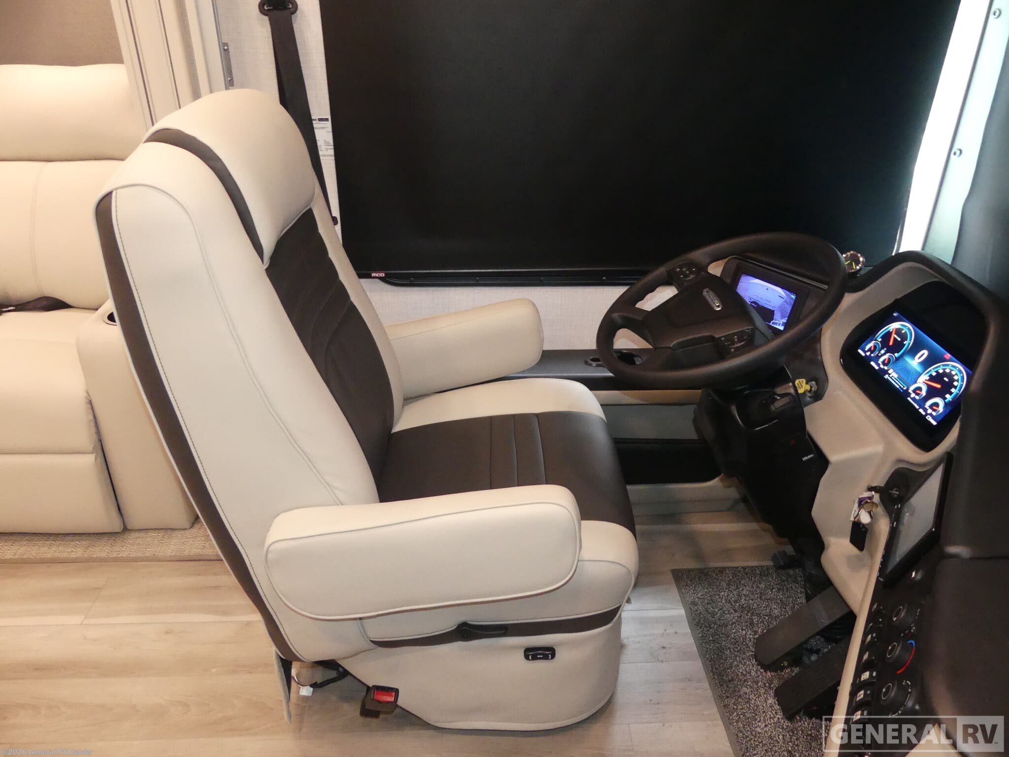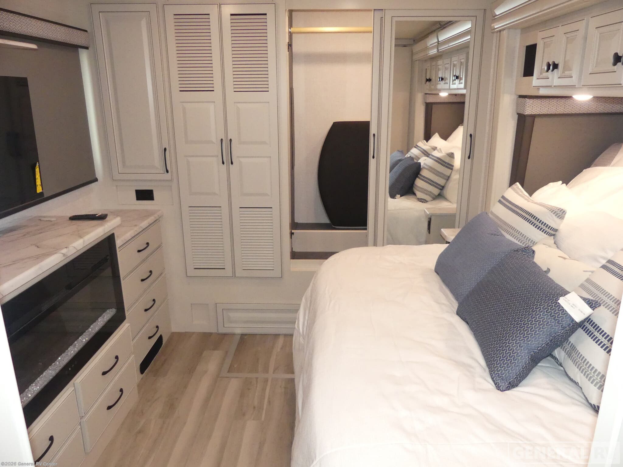 Experience luxurious travel in the 2026 Holiday Rambler Nautica 33TL, a class A diesel motorhome built on the powerful Freightliner XC-Series chassis with a 340-horsepower Cummins 6.7L diesel engine. At just over 35 feet long, this coach delivers an impressive blend of elegance and functionality with its three slides that dramatically expand your living space. The front living area features a comfortable sleeper sofa and dream dinette, both perfect for relaxing or entertaining guests, while the center kitchen boasts a full-size residential refrigerator, convection microwave, and induction cooktop for creating gourmet meals on the road. The rear bedroom is a true sanctuary with its Encore Series king bed and adjacent fireplace, creating the perfect retreat after a day of adventure. The well-appointed bathroom features a fiberglass shower with glass door, skylight, and residential fixtures. Two strategically placed fireplaces add both warmth and ambiance to this stunning motorhome. Outside, enjoy the convenience of the exterior entertainment center with LED TV and Bluetooth soundbar. With residential-style amenities, ample storage thanks to the Delta Foundation, and the exceptional drive quality of the V-Ride rear suspension system, the Nautica 33TL delivers an unmatched travel experience. For more information on this premium diesel pusher, visit your nearest General RV dealership.