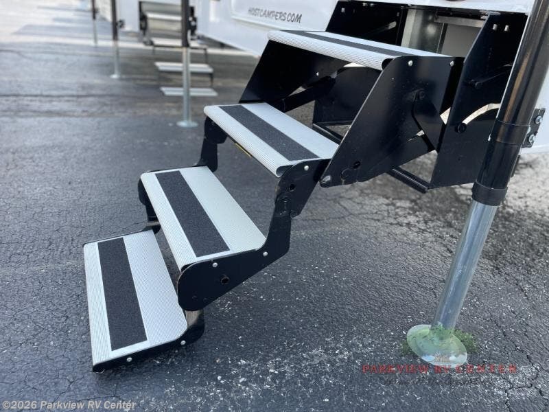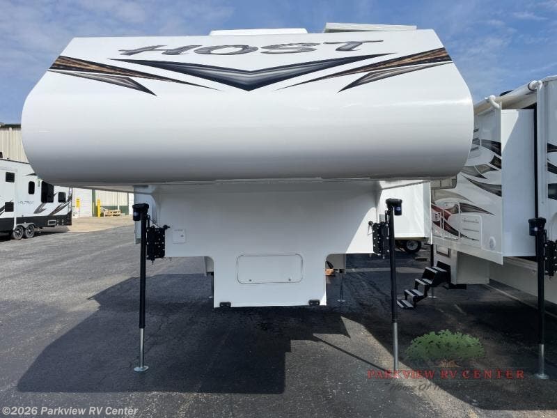 With any Host Industries Host Campers truck camper, there is ease of setting up with electric jacks with a wireless remote, and security when traveling thanks to the heavy duty camper tie down brackets. Each is constructed with two or three slide outs giving you more interior space on an Ultralite 100% aluminum structure with vacuum bonded foam insulated walls, a floor and a ceiling, plus there is a one-piece TPO roof. Some conveniences include an enclosed service center, enclosed and heated holding tanks, large J-rail rain gutters, and access panels for the slide out motors, water tank and holding tanks to mention a few. And the interior is just as impressive from the style, decor choices, the 12 volt LED lighting system, the Grani-coat solid surface countertops, and the many options you can add to customize your Host Camper!