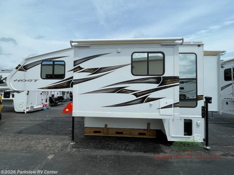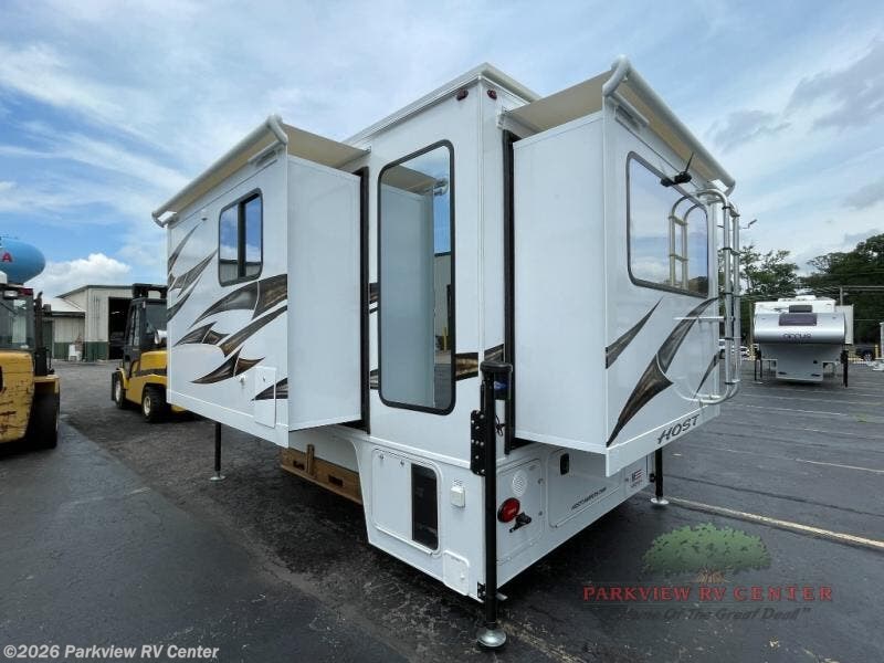 With any Host Industries Host Campers truck camper, there is ease of setting up with electric jacks with a wireless remote, and security when traveling thanks to the heavy duty camper tie down brackets. Each is constructed with two or three slide outs giving you more interior space on an Ultralite 100% aluminum structure with vacuum bonded foam insulated walls, a floor and a ceiling, plus there is a one-piece TPO roof. Some conveniences include an enclosed service center, enclosed and heated holding tanks, large J-rail rain gutters, and access panels for the slide out motors, water tank and holding tanks to mention a few. And the interior is just as impressive from the style, decor choices, the 12 volt LED lighting system, the Grani-coat solid surface countertops, and the many options you can add to customize your Host Camper!