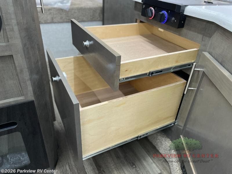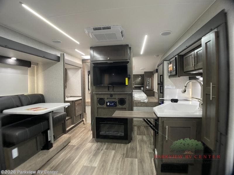 Triple slides offer more floor space in this truck camper with a rear U-shaped dinette slide and opposing side slides. You also have dual access to the front queen bed with clothing storage and there is a full bathroom to stay refreshed before mealtime or bedtime. The galley kitchen offers everything at your fingertips to cook meals each day. You can dine at the couch with a removable table or choose an optional full wardrobe or laundry center option in its place. You'll also enjoy a U-shaped dinette that can sleep two, or you can choose the optional 6' couch or optional theater seating. There are other options to choose from such as adding a living room and/or bedroom TV and a fireplace to stay cozy in the living and kitchen area.