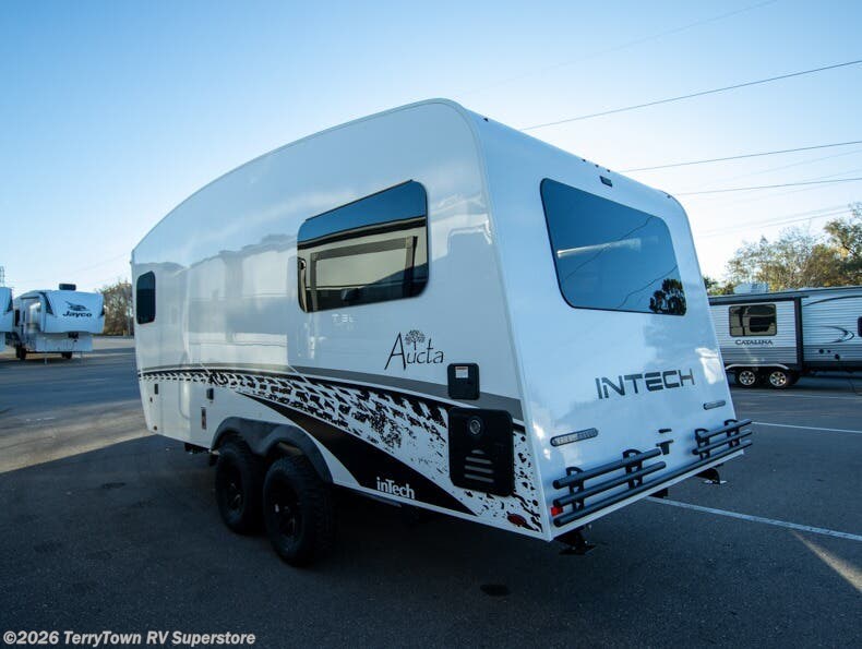 With any Aucta travel trailer by inTech RV you will enjoy creative interior spaces, luxury features, and smart storage spaces for a one-of-a-kind trailer. The one-piece fiberglass roof, all-aluminum cage frame, and Dexter torsion axle provide durable construction and smooth towing, and the fold-away double entry steps and power tongue jack will make set-up easier than ever. Inside, you'll find Infinity woven flooring, a large farmhouse sink, USB ports and 120V outlets, plenty of storage compartments, and MaxxAir vent fans to keep everything fresh. These models also include bubble foil insulation in the walls and ceiling, along with a 25K BTU furnace and a 15K BTU A/C so you can make memories year around!