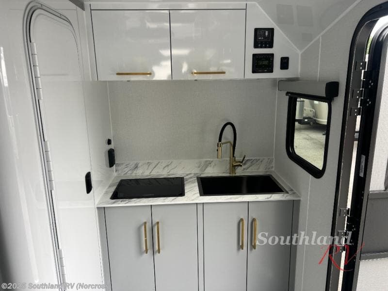 With any Black Wing toy hauler travel trailer by inTech RV, you will durable construction thanks to the fully welded cage and frame construction. There is also a one-piece aluminum roof, a power tongue jack, and solar prep outside for off-grid capabilities. The interior features ample storage space, a MaxxAir vent, a large farmhouse style sink with a gold faucet, and a Bluetooth stereo plus a Smart TV to keep you entertained. Additional features include USB and 120V outlets, an on-demand water heater, aluminum garage flooring, and available options to further customize your toy hauler!