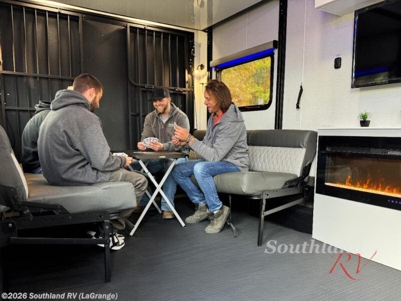 This rugged toy hauler combines durability with all the comforts of home, featuring high-end residential aluminum cabinetry, solid surface countertops, a large entertainment area with built-in fireplace, spacious wardrobe closet, and abundant storage throughout. The innovative sleeping and lounge space provides a full 60" x 80" bed that conveniently stores against the ceiling, while two versatile sofas convert into additional sleeping space and fold away to keep the garage open for gear. Custom floor mats offer a comfortable surface underfoot and can be easily removed when loading dirty equipment.
