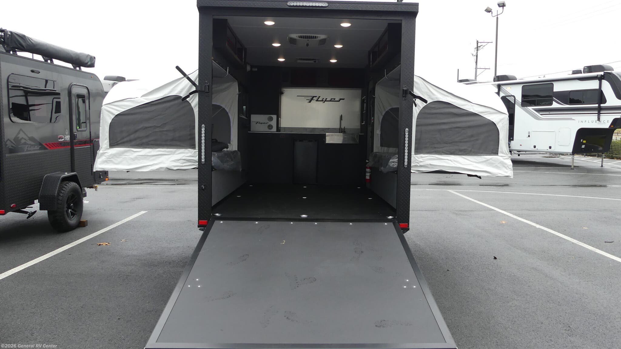 The Flyer Discover offers a generous interior to accommodate all your camping needs. It features a standard roadside tip-out and can be upgraded with an additional curbside tip-out. This model is designed to fit a side by side vehicle, enhancing your outdoor adventure experience. inTech Flyers are designed for serious camping by people who camp! Interiors are roomy, extremely functional and built for rugged use. Embrace the great outdoors without sacrificing comfort by going off-grid and immersing yourself in nature while still enjoying modern amenities. Cook up a snack in the kitchen or grab a cold drink from the refrigerator on your way out to hit the trails. A 46”x81” tip out bed will welcome tired travelers back after a long day of fun. Discover pulls double-duty, not only as a spacious adventure camper, but also as an easy-to-tow micro-lite toy hauler. Discover takes you places you can’t go with a traditional toy hauler and without the need for a dedicated tow vehicle.