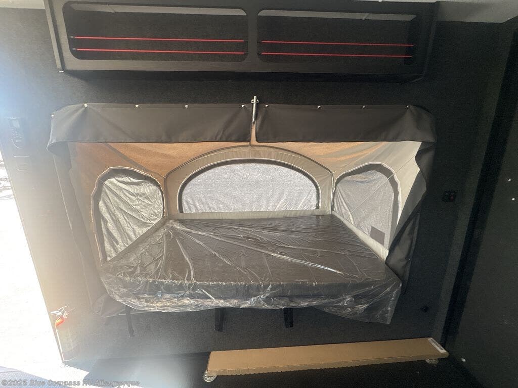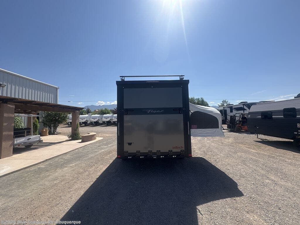 The 2026 inTech Flyer Discover is a rugged, expandable toy hauler designed for adventurous exploration, offering a blend of functionality and agility. It features an all-aluminum, all-tube cage frame, a 2" rear receiver for bikes, and an optional roof rack for kayaks. The interior boasts a farmhouse sink, a two-burner cooktop, and a rear ramp door with tie-down rings, making it suitable for hauling toys and enjoying outdoor activities