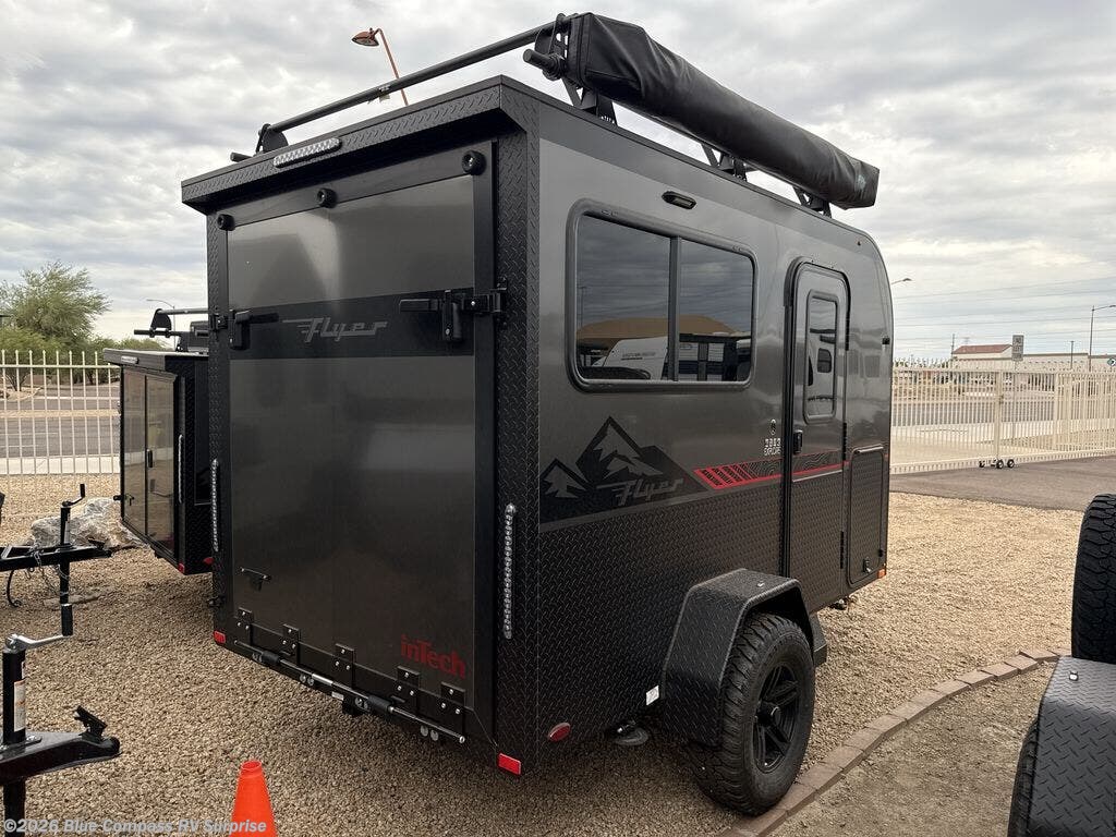 The inTech RV Flyer travel trailers and toy hauler expandables are ready for adventure whenever you are! With the all-aluminum, all-tube cage frame, the Flyer has been built with lightweight and long-lasting materials so that you can enjoy your unit for many, many years. The Flyer has a rugged design so that you can confidently explore new territory and go where traditional RVs cannot. The Flyer has a 2" rear receiver rated for 175 pounds which allows you to bring along your bikes, and the Bluetooth stereo has two speakers you can always have your best music playing. The optional roof rack will allow you to bring along kayaks, and there are more available options depending on the model you choose.