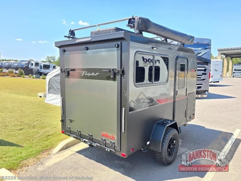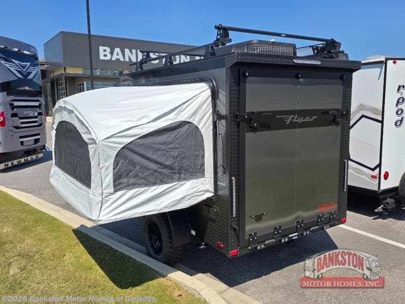 The inTech RV Flyer travel trailers and toy hauler expandables are ready for adventure whenever you are! With the all-aluminum, all-tube cage frame, the Flyer has been built with lightweight and long-lasting materials so that you can enjoy your unit for many, many years. The Flyer has a rugged design so that you can confidently explore new territory and go where traditional RVs cannot. The Flyer has a 2" rear receiver rated for 175 pounds which allows you to bring along your bikes, and the Bluetooth stereo has two speakers you can always have your best music playing. The optional roof rack will allow you to bring along kayaks, and there are more available options depending on the model you choose.