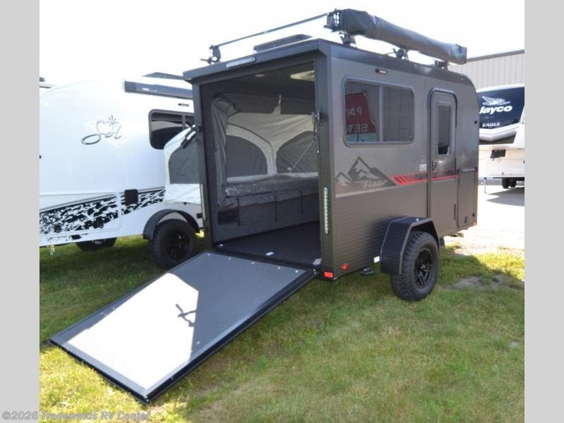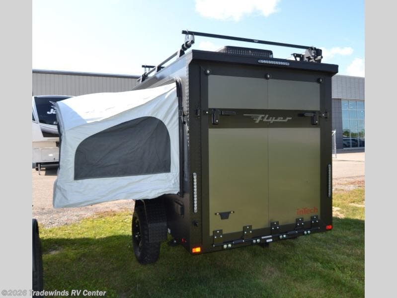 The inTech RV Flyer travel trailers and toy hauler expandables are ready for adventure whenever you are! With the all-aluminum, all-tube cage frame, the Flyer has been built with lightweight and long-lasting materials so that you can enjoy your unit for many, many years. The Flyer has a rugged design so that you can confidently explore new territory and go where traditional RVs cannot. The Flyer has a 2" rear receiver rated for 175 pounds which allows you to bring along your bikes, and the Bluetooth stereo has two speakers you can always have your best music playing. The optional roof rack will allow you to bring along kayaks, and there are more available options depending on the model you choose.