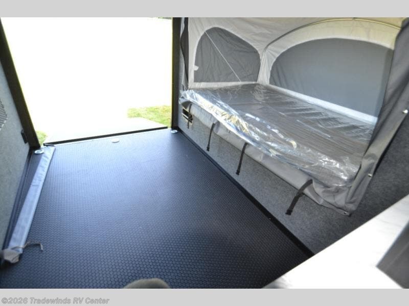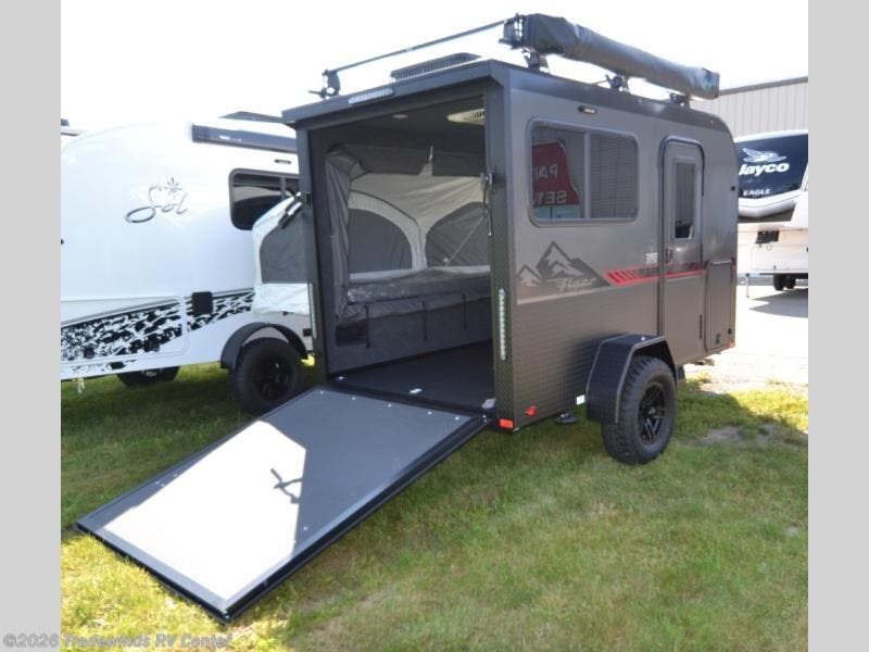 Not only is this Flyer toy hauler built to go where most traditional RVs cannot, but it is also built with a standard rear ramp or optional double rear doors, and six tie-down rings so that it can also serve as the perfect cargo transport too! The interior is spacious with its 46" x 81" tip-out bed, and if you add the second optional tip-out bed, you'll have an amazing amount of space on the inside. This expandable toy hauler is very functional, but you can make it even more enticing by adding optional Adventure Package that comes with an A/C, off-road tires, a roof rack, plus a slide out kitchen! This will allow you to cook wherever you choose to camp. The dry weight for this unit ranges from 1,580-2,110 LBS, the tongue weight ranges from 250-485 LBS, and the net carrying capacity ranges from 880-1,410 LBS.