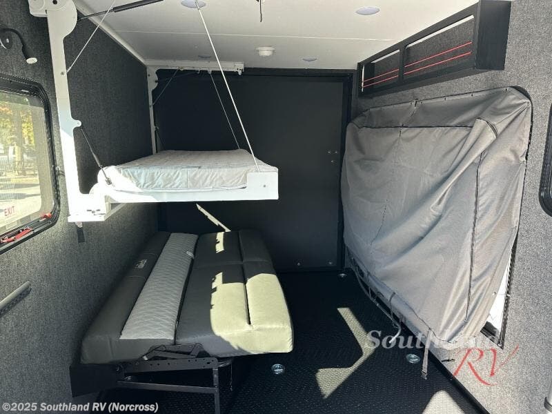 You asked for it and inTech RV delivered with this toy hauler expandable! You will enjoy some of the same features as the Discover model, but will also appreciate a wet bath in the Forge. There is a porcelain toilet, aluminum walls with a sealing exterior door so you don't need a shower curtain, storage space, and even a bath roof vent with an onboard switch! The kitchen includes everything you need to cook meals each day, including a two burner cooktop, a large farmhouse sink, and a spacious 8 cu.ft. 12V refrigerator! The 80" x 160" garage floor space features durable black coin flooring and is large enough to bring in most side-by-sides, plus there are tie-downs to keep your toys secure. For sleeping space, you'll find a tip-out bed and a standard sleeper sofa, and if you have more campers tagging along, you can add the optional drop-down bunk, or even bring your own air mattress! A few more stand-out features you'll love on the Forge are the on-demand LP water heater, the aluminum walk-on roof, tinted windows, and Airline Track sidewall tie-down area! The dry weight for this model ranges from 3,845 lbs. - 4,300 lbs., and the carrying capacity ranges from 2,700 lbs. - 3,155 lbs.