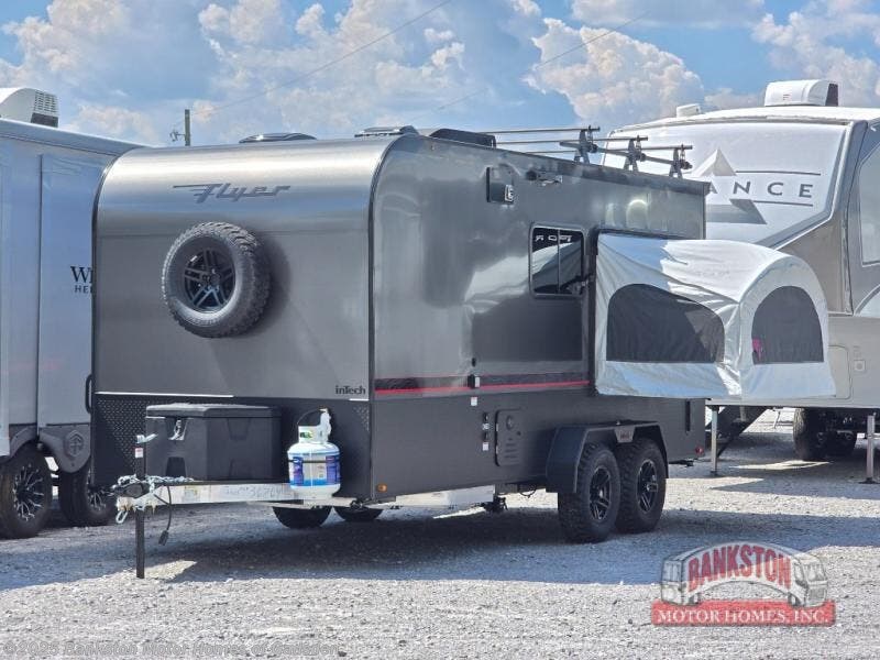 The inTech RV Flyer travel trailers and toy hauler expandables are ready for adventure whenever you are! With the all-aluminum, all-tube cage frame, the Flyer has been built with lightweight and long-lasting materials so that you can enjoy your unit for many, many years. The Flyer has a rugged design so that you can confidently explore new territory and go where traditional RVs cannot. The Flyer has a 2" rear receiver rated for 175 pounds which allows you to bring along your bikes, and the Bluetooth stereo has two speakers you can always have your best music playing. The optional roof rack will allow you to bring along kayaks, and there are more available options depending on the model you choose.