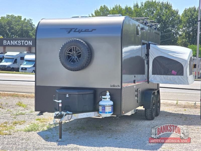 The inTech RV Flyer travel trailers and toy hauler expandables are ready for adventure whenever you are! With the all-aluminum, all-tube cage frame, the Flyer has been built with lightweight and long-lasting materials so that you can enjoy your unit for many, many years. The Flyer has a rugged design so that you can confidently explore new territory and go where traditional RVs cannot. The Flyer has a 2" rear receiver rated for 175 pounds which allows you to bring along your bikes, and the Bluetooth stereo has two speakers you can always have your best music playing. The optional roof rack will allow you to bring along kayaks, and there are more available options depending on the model you choose.