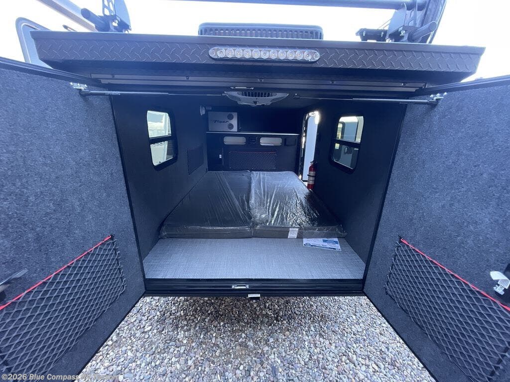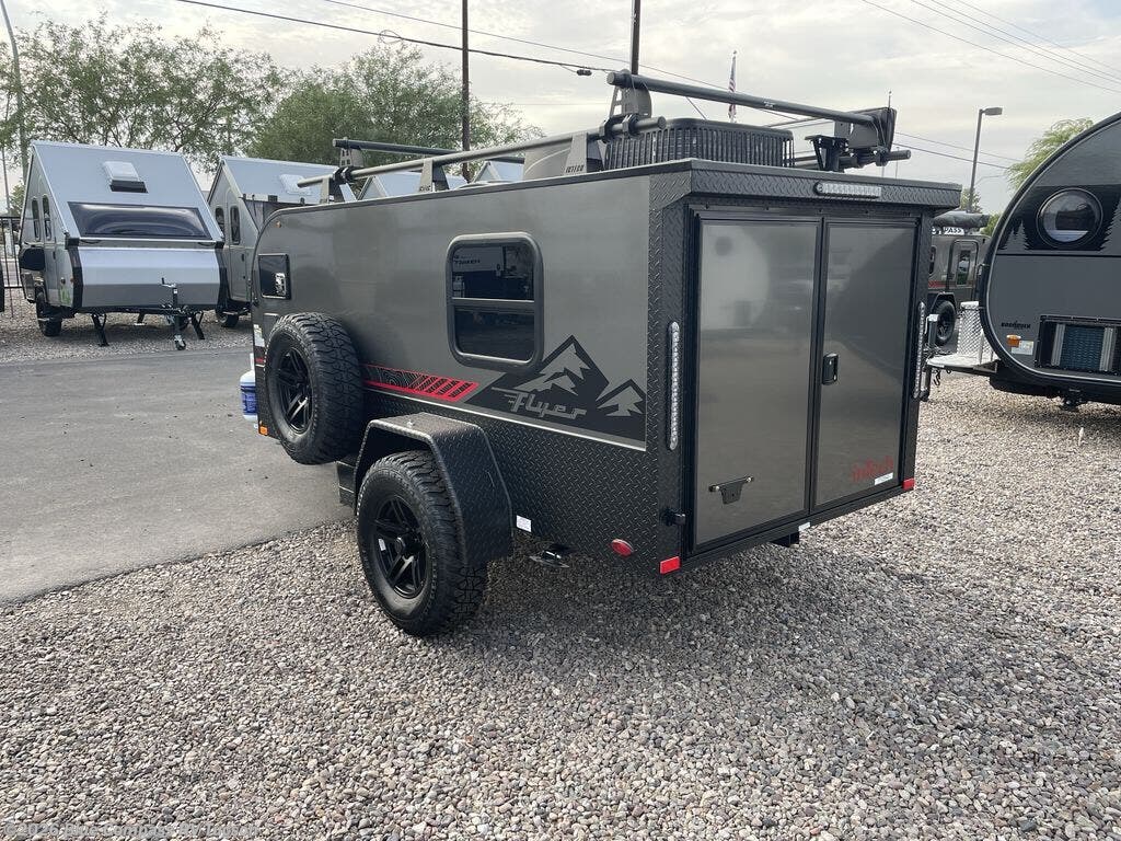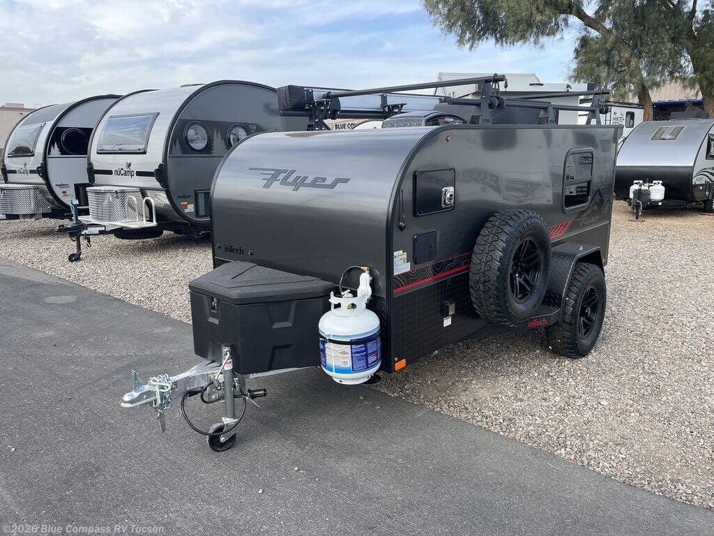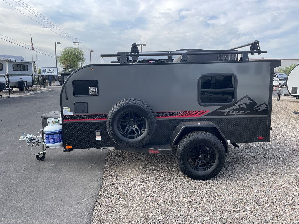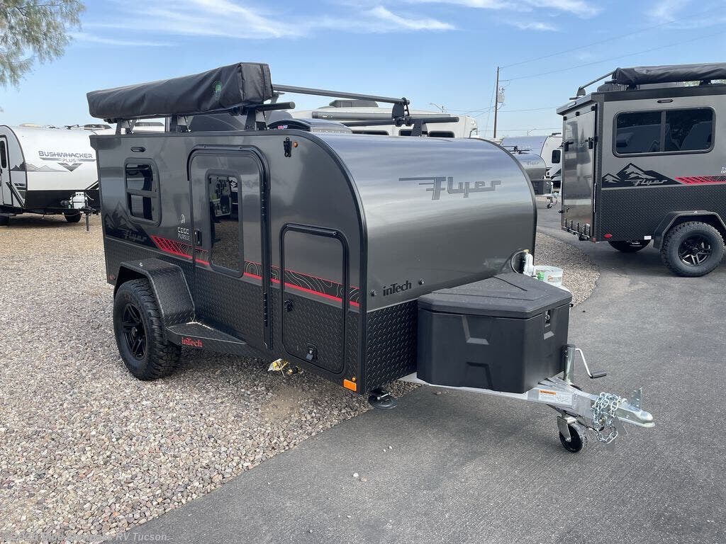The inTech RV Flyer travel trailers and toy hauler expandables are ready for adventure whenever you are! With the all-aluminum, all-tube cage frame, the Flyer has been built with lightweight and long-lasting materials so that you can enjoy your unit for many, many years. The Flyer has a rugged design so that you can confidently explore new territory and go where traditional RVs cannot. The Flyer has a 2" rear receiver rated for 175 pounds which allows you to bring along your bikes, and the Bluetooth stereo has two speakers you can always have your best music playing. The optional roof rack will allow you to bring along kayaks, and there are more available options depending on the model you choose.