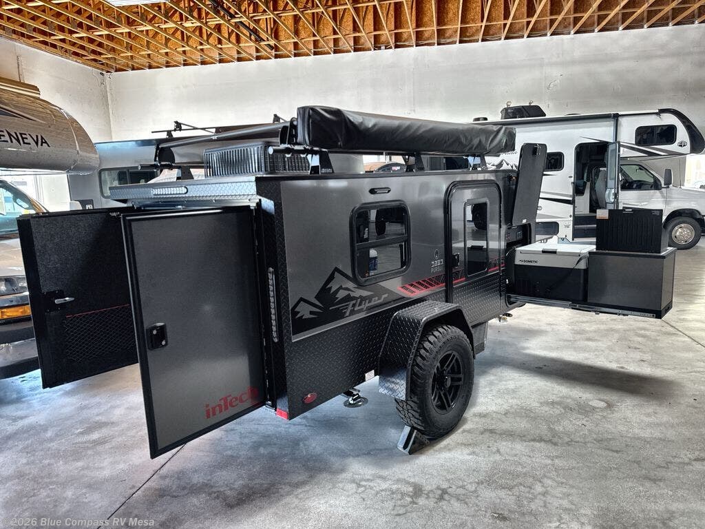 The inTech RV Flyer travel trailers and toy hauler expandables are ready for adventure whenever you are! With the all-aluminum, all-tube cage frame, the Flyer has been built with lightweight and long-lasting materials so that you can enjoy your unit for many, many years. The Flyer has a rugged design so that you can confidently explore new territory and go where traditional RVs cannot. The Flyer has a 2" rear receiver rated for 175 pounds which allows you to bring along your bikes, and the Bluetooth stereo has two speakers you can always have your best music playing. The optional roof rack will allow you to bring along kayaks, and there are more available options depending on the model you choose.