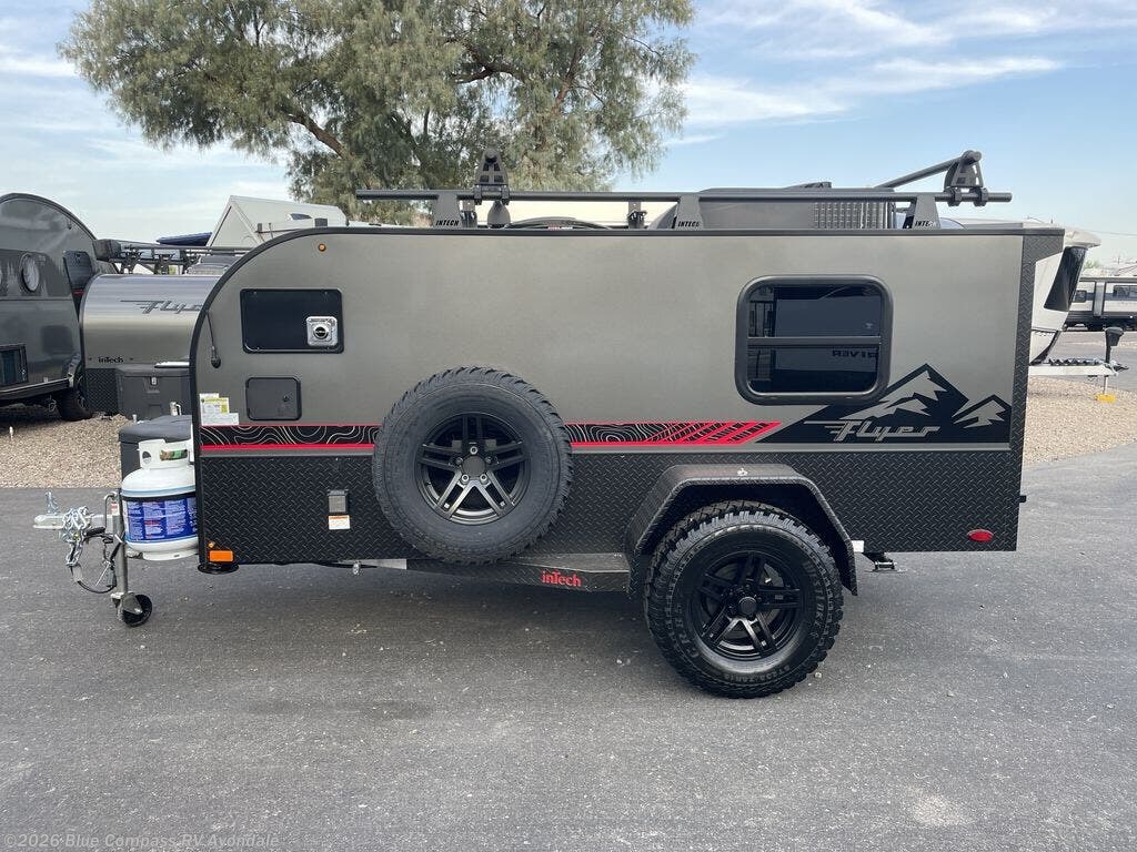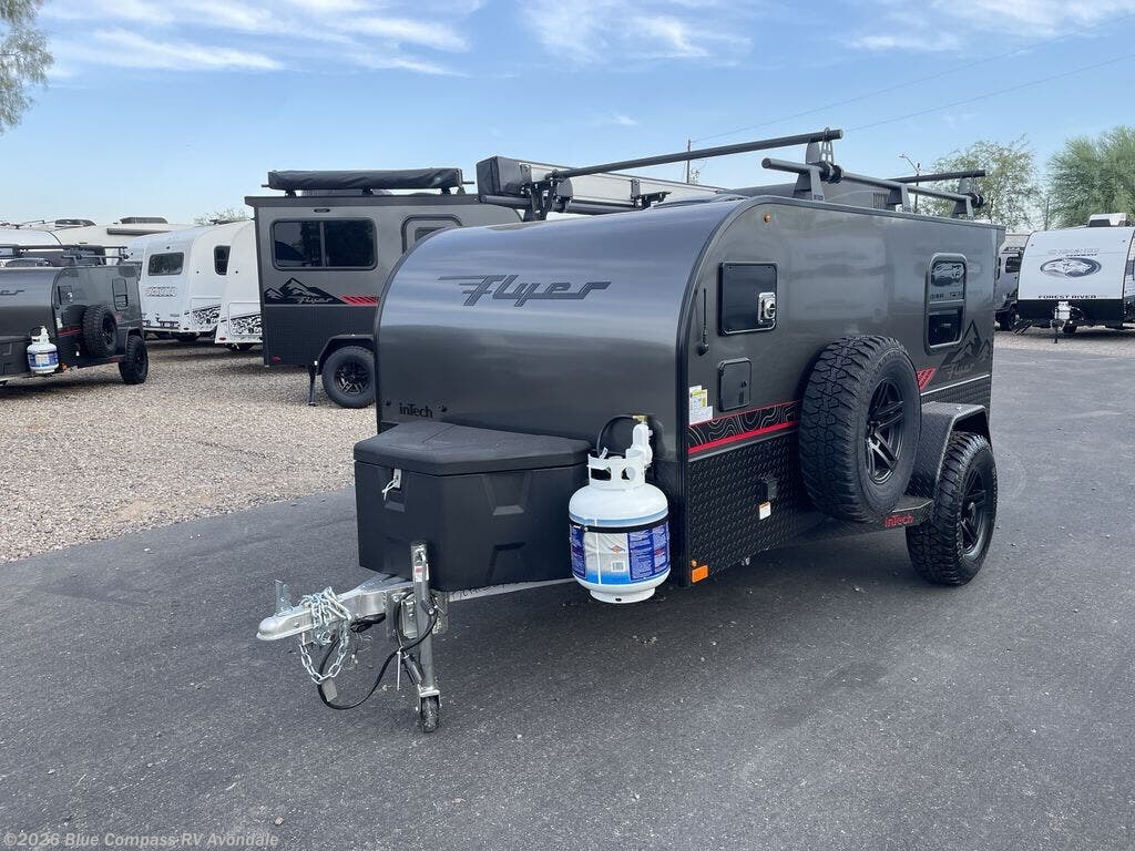 The inTech RV Flyer travel trailers and toy hauler expandables are ready for adventure whenever you are! With the all-aluminum, all-tube cage frame, the Flyer has been built with lightweight and long-lasting materials so that you can enjoy your unit for many, many years. The Flyer has a rugged design so that you can confidently explore new territory and go where traditional RVs cannot. The Flyer has a 2" rear receiver rated for 175 pounds which allows you to bring along your bikes, and the Bluetooth stereo has two speakers you can always have your best music playing. The optional roof rack will allow you to bring along kayaks, and there are more available options depending on the model you choose.