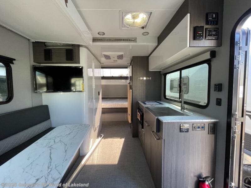 The O-R-V travel trailers and toy hauler by inTech RV allow you to experience adventure off the beaten path with its rugged exterior and lightweight construction provided by the all-aluminum fully welded cage frame. The power tongue jack will make setting up camp a breeze, plus there is a fold-away double entry step and exterior lighting for added convenience. Inside, you'll find a large farmhouse style sink, a MaxxAir vent for ventilation, plus infinity woven flooring. There is a Bluetooth stereo with four speakers and a 32" Smart TV included with each model, plus USB and 110V outlets to keep your electronics charged and ready to go. Further customize your O-V-R by adding the optional power awning or the optional Off-Grid Package with 400 watts of solar power, 20 amp hours of lithium batteries, and a 2,000 watt inverter!