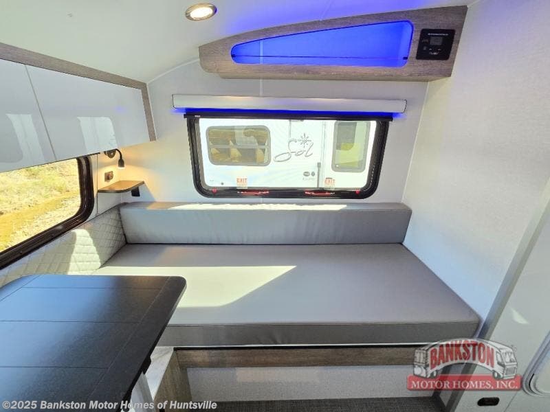 With any Sol travel trailer by inTech RV you will find strong, durable construction consisting of lightweight aluminum that is easier to tow and resists rust, water, and dents. The Tilt-Forward Design creates more space inside so you can stretch out, and the panoramic windshield gives a great view of the mountains, ocean, or forest! The elegant interior features tinted windows with shades, Infinity woven flooring, and a stainless steel cooktop and microwave. You will stay comfortable year around since these models include a 15K BTU A/C and a 16K BTU furnace. The optional Rover Package can also be added that features rugged decals, off-road tires with a 3" lift, two different color choices to choose from, plus more!
