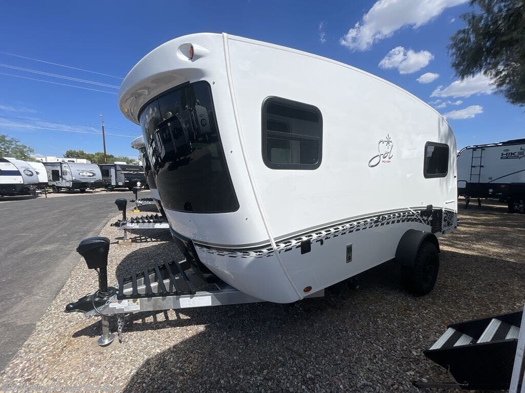 With any Sol travel trailer by inTech RV you will find strong, durable construction consisting of lightweight aluminum that is easier to tow and resists rust, water, and dents. The Tilt-Forward Design creates more space inside so you can stretch out, and the panoramic windshield gives a great view of the mountains, ocean, or forest! The elegant interior features tinted windows with shades, Infinity woven flooring, and a stainless steel cooktop and microwave. You will stay comfortable year around since these models include a 15K BTU A/C and a 16K BTU furnace. The optional Rover Package can also be added that features rugged decals, off-road tires with a 3" lift, two different color choices to choose from, plus more!