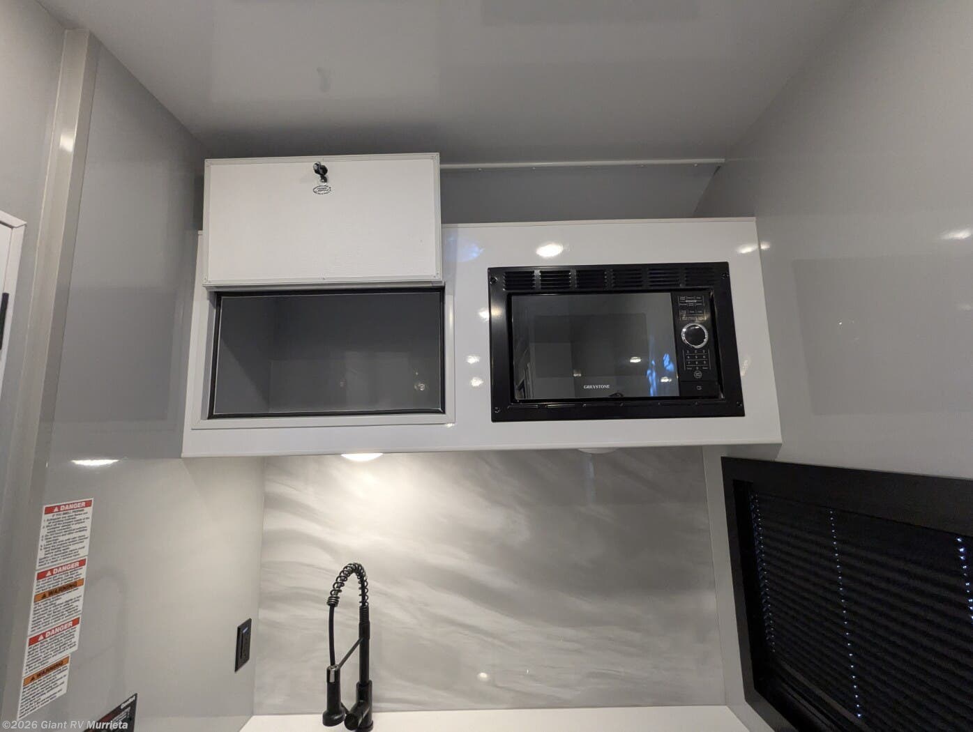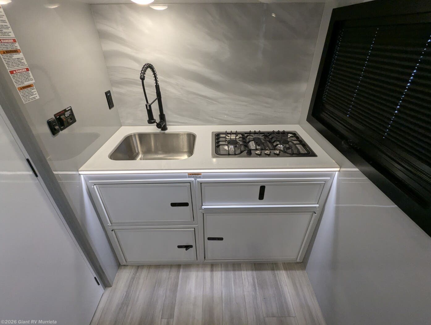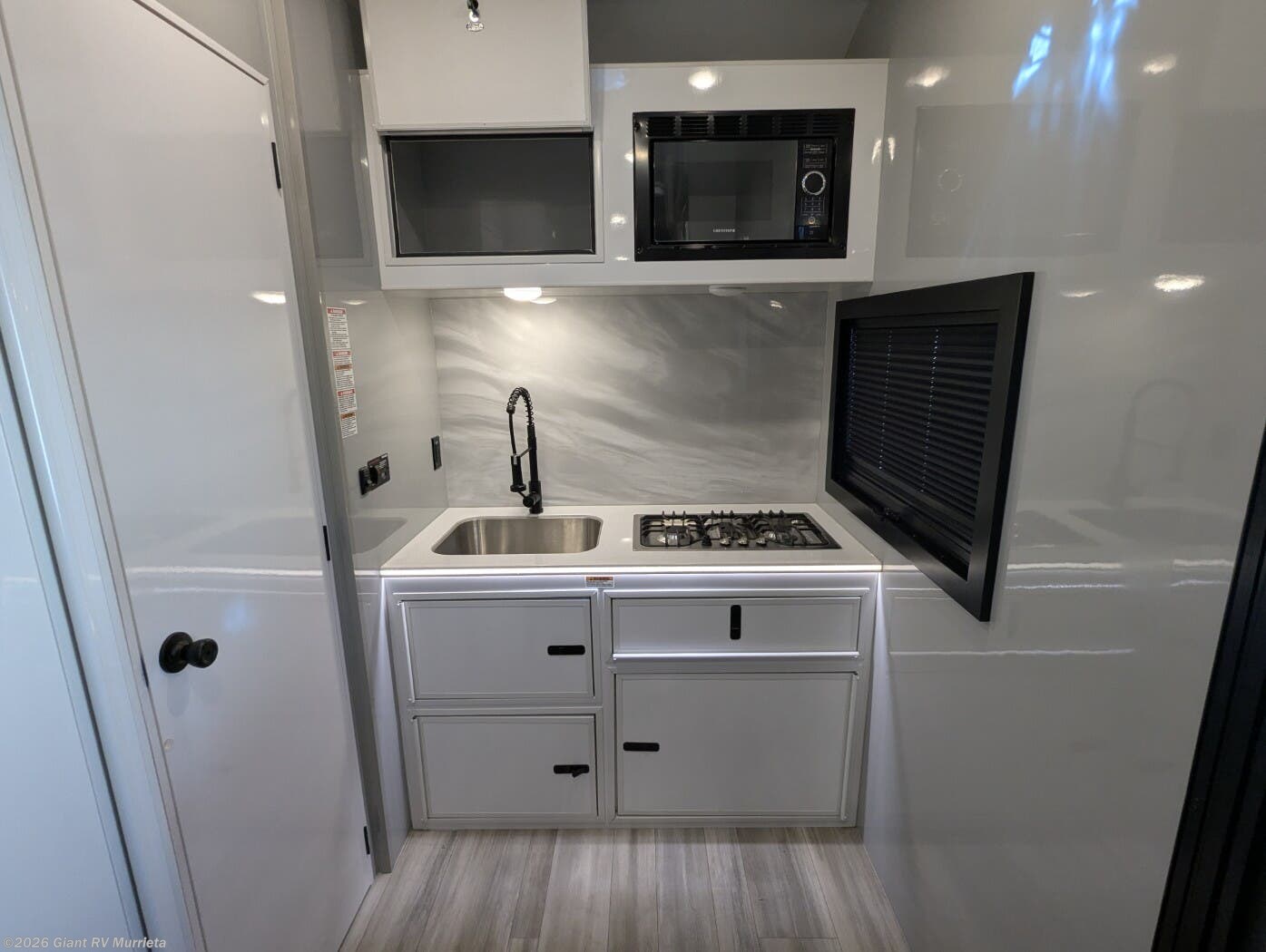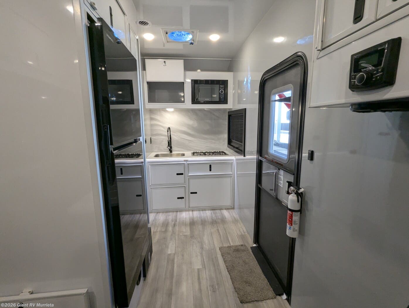 - Modern Amenities: Features dual A/C units, a galley kitchen with residential refrigerator, three-burner cooktop, convection microwave, and full bath with skylight for easy off-grid meals.