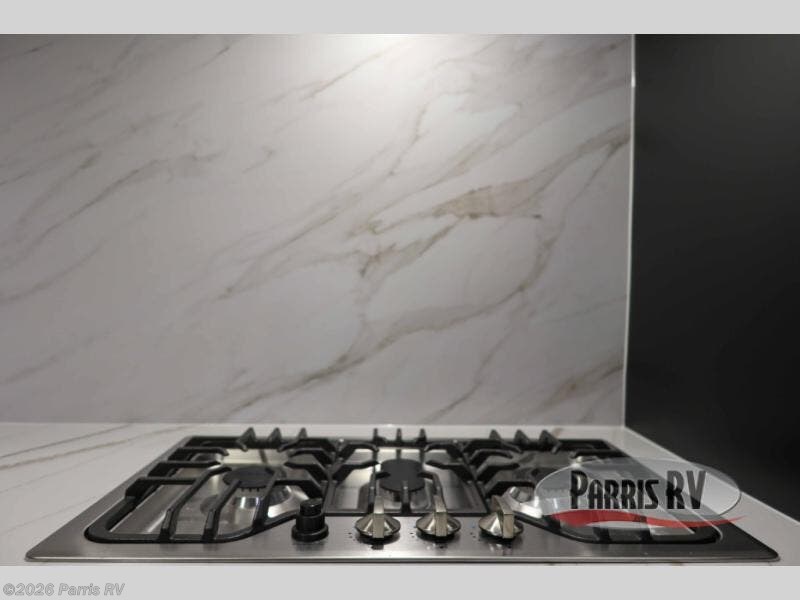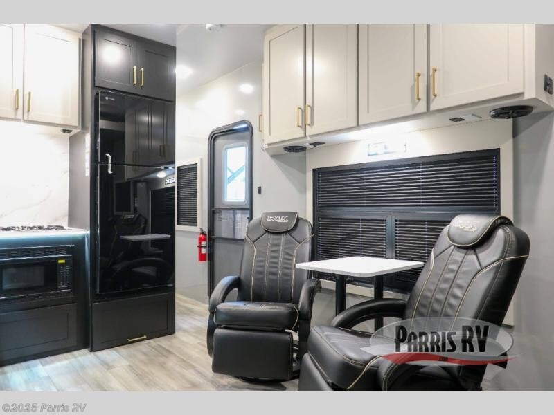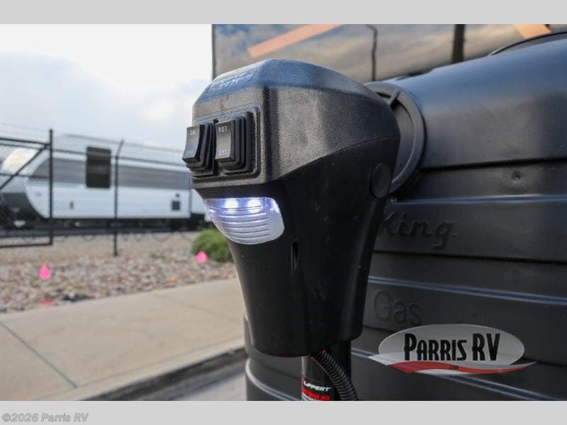 Pack your bags and head for the campground in this luxury toy hauler! You will love having your own bedroom up front with a 70" x 80" king bed, dual nightstands and wardrobes, plus overhead storage. If you have any guests staying over, they can sleep on the drop-down queen bed or bottom power dinette. A three-burner gas cooktop and 10.7 cu. ft. 12V refrigerator will let you cook and store food, and the full bath onboard means you won't have to leave the camper in the middle of the night! There is also a lounge chair with a table where you can relax with a book in the evenings or your coffee in the morning!