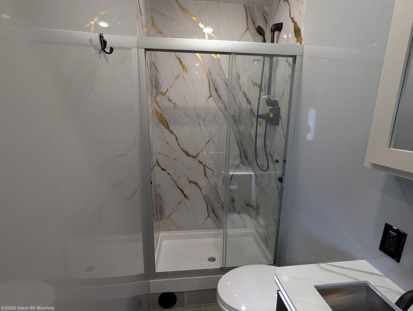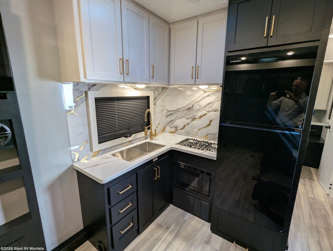 - Luxury Amenities: Features air conditioning, a kitchen with a refrigerator, microwave, and a power awning with LED lights for comfort.