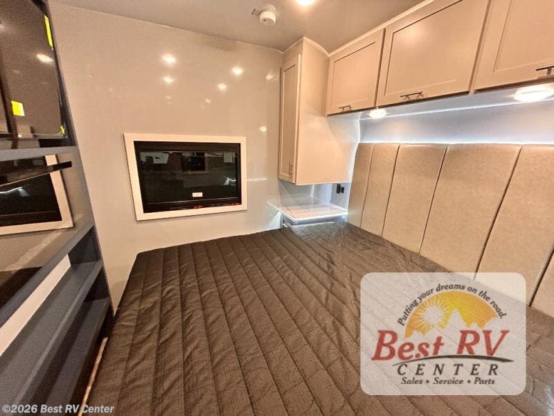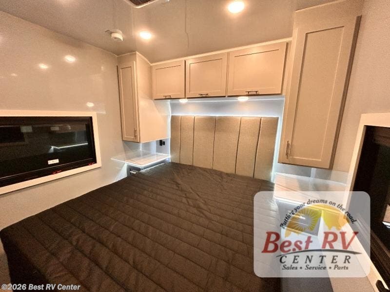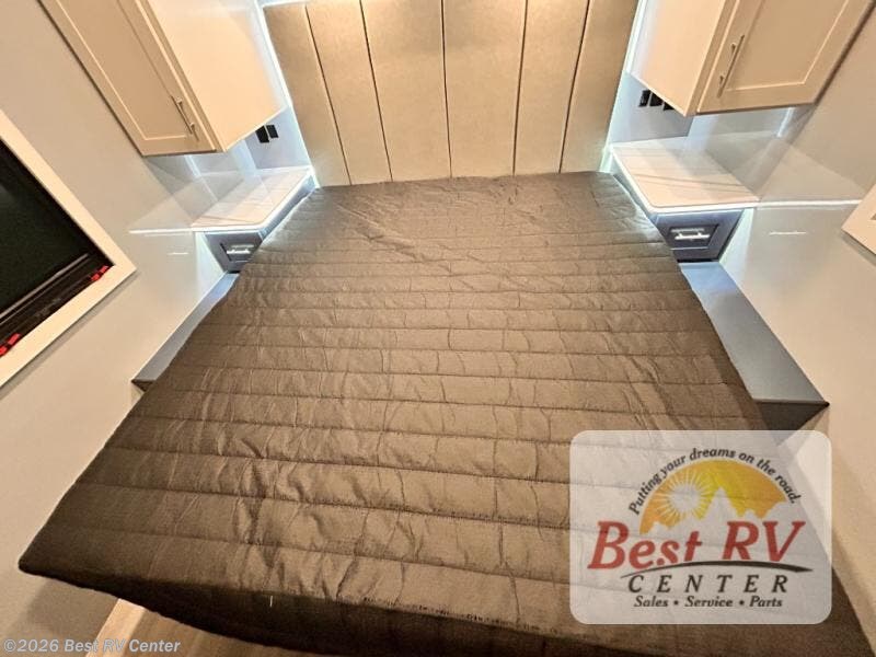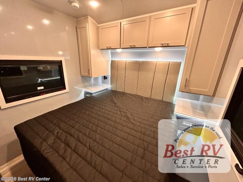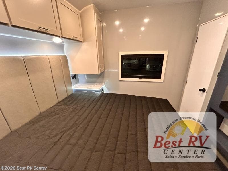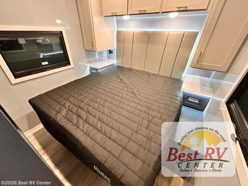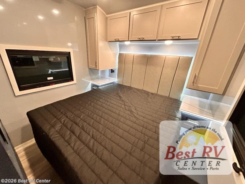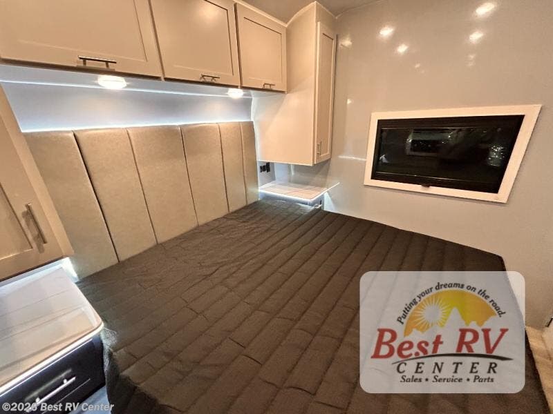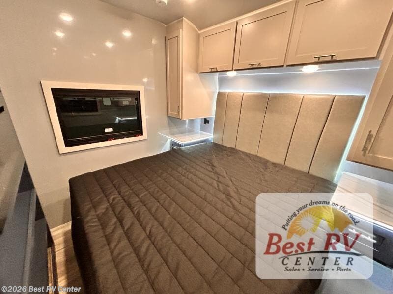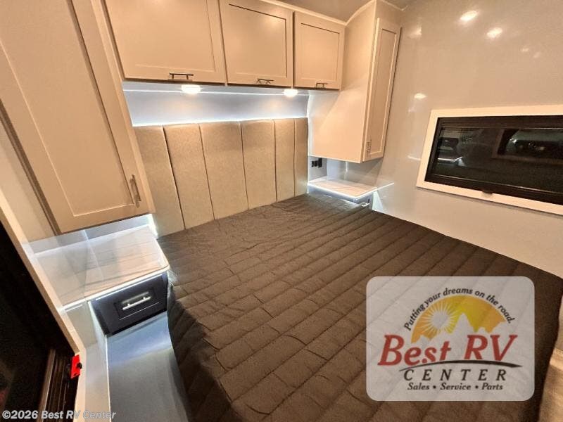 - BEDROOM SUITE: KING IROK MATTRESS W/ HEADBOARD & FLIP-UP STORAGE BELOW BED, DUAL LED NIGHTSTANDS, OVERHEAD WARDROBES W/ READING LIGKTS & ENTERTAINMENT CENTER