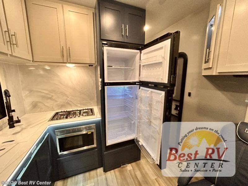 - KITCHEN: 10.7 CU FT 12 VOLT REFRIGERATOR, MICROWAVE. 3-BURNER COOKTOP. CHEF'S STAINLESS STEEL SINK WI LED SOLID-SURFACE COUNTERTOP MATCHING SINK COVERS & FAN•TASTIC FAN