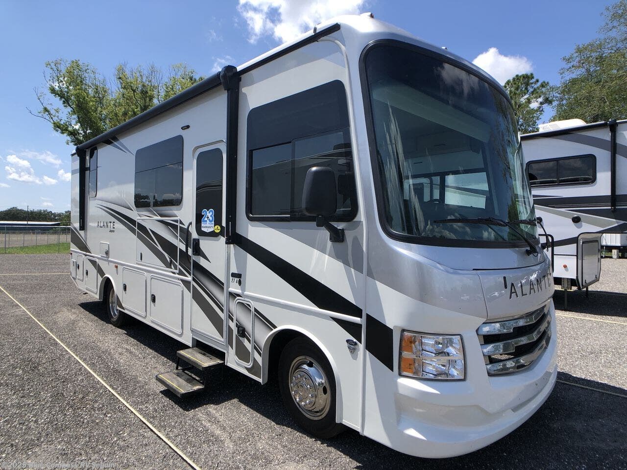 With any Alante Class A gas motorhome by Jayco, the mandatory Customer Value package provides JRide technology with a computer-balanced driveshaft ensuring smooth and efficient power transfer to the wheels, and SACHS shock absorbers offering independent adjustments to the road conditions. There is also a one-piece, seamless, crowned fiberglass roof, and an exterior entertainment center to watch shows and movies. The automatic hydraulic leveling jacks, 120 in. panoramic windshield, 200W solar panel, and the electric-powered entrance step will make traveling that much easier. And the interior equipment includes a Sony infotainment center with Apple CarPlay and Android Auto, a backup and side-view cameras for easy parking, plus a 6-way power driver seat for comfortable and safe driving. You will also love the power front privacy shade with manual side privacy shades, LED-lit hardwood fascia and countertops, a pop-up charging station in the kitchen and a USB port and wireless charging in the nightstands.