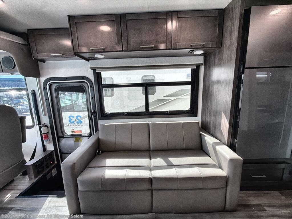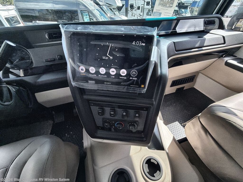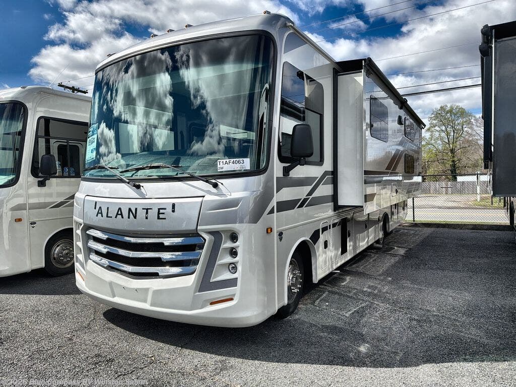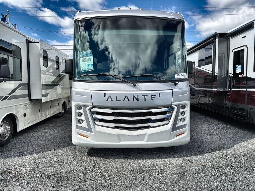 With any Alante Class A gas motorhome by Jayco, the mandatory Customer Value package provides JRide technology with a computer-balanced driveshaft ensuring smooth and efficient power transfer to the wheels, and SACHS shock absorbers offering independent adjustments to the road conditions. There is also a one-piece, seamless, crowned fiberglass roof, and an exterior entertainment center to watch shows and movies. The automatic hydraulic leveling jacks, 120 in. panoramic windshield, 200W solar panel, and the electric-powered entrance step will make traveling that much easier. And the interior equipment includes a Sony infotainment center with Apple CarPlay and Android Auto, a backup and side-view cameras for easy parking, plus a 6-way power driver seat for comfortable and safe driving. You will also love the power front privacy shade with manual side privacy shades, LED-lit hardwood fascia and countertops, a pop-up charging station in the kitchen and a USB port and wireless charging in the nightstands.