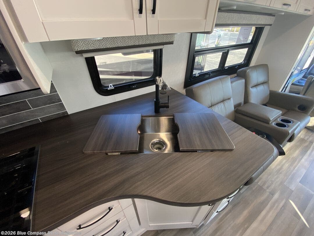 With any Alante Class A gas motorhome by Jayco, the mandatory Customer Value package provides JRide technology with a computer-balanced driveshaft ensuring smooth and efficient power transfer to the wheels, and SACHS shock absorbers offering independent adjustments to the road conditions. There is also a one-piece, seamless, crowned fiberglass roof, and an exterior entertainment center to watch shows and movies. The automatic hydraulic leveling jacks, 120 in. panoramic windshield, 200W solar panel, and the electric-powered entrance step will make traveling that much easier. And the interior equipment includes a Sony infotainment center with Apple CarPlay and Android Auto, a backup and side-view cameras for easy parking, plus a 6-way power driver seat for comfortable and safe driving. You will also love the power front privacy shade with manual side privacy shades, LED-lit hardwood fascia and countertops, a pop-up charging station in the kitchen and a USB port and wireless charging in the nightstands.
