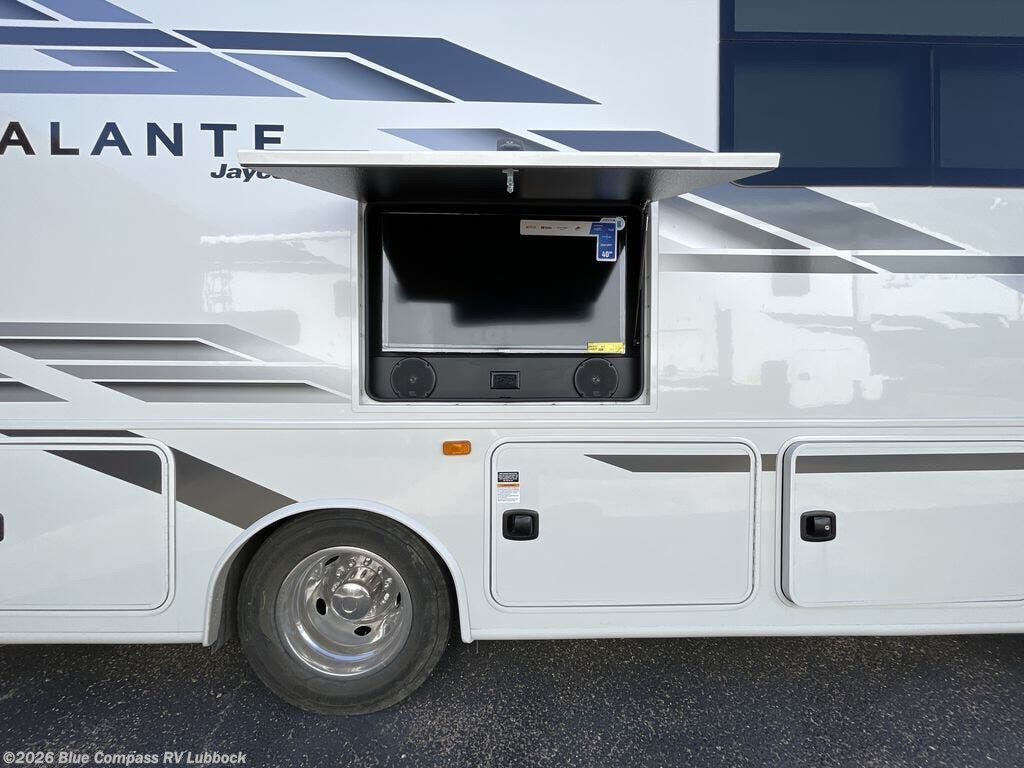 With any Alante Class A gas motorhome by Jayco, the mandatory Customer Value package provides JRide technology with a computer-balanced driveshaft ensuring smooth and efficient power transfer to the wheels, and SACHS shock absorbers offering independent adjustments to the road conditions. There is also a one-piece, seamless, crowned fiberglass roof, and an exterior entertainment center to watch shows and movies. The automatic hydraulic leveling jacks, 120 in. panoramic windshield, 200W solar panel, and the electric-powered entrance step will make traveling that much easier. And the interior equipment includes a Sony infotainment center with Apple CarPlay and Android Auto, a backup and side-view cameras for easy parking, plus a 6-way power driver seat for comfortable and safe driving. You will also love the power front privacy shade with manual side privacy shades, LED-lit hardwood fascia and countertops, a pop-up charging station in the kitchen and a USB port and wireless charging in the nightstands.