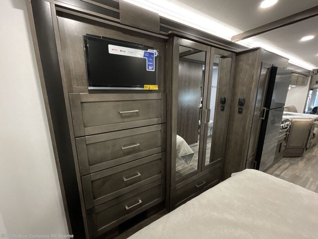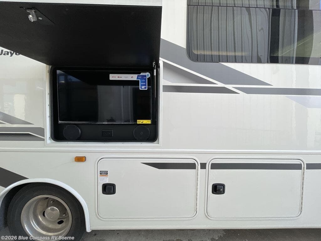 Travel to see new places and enjoy interior comforts as well as outdoor entertainment with this coach! After easily setting up the 23' electric awning you can relax and unwind while taking in the scenery or watching the the exterior LED HD Smart TV. The chef can utilize the outside kitchen or the full kitchen amenities inside such as a 10 cu. ft. refrigerator, the all-in-one cooktop and oven, plus a residential-size microwave. There is even a pop-up charging center. Enjoy privacy in the rear bedroom while you sleep on the walk-around queen bed, and add the TV option if you like. You will find seating in the main area on the Jayco-exclusive easy-operation legless dinette table and the jack-knife sofa, or choose the theater seating option. The cockpit table also gives you another surface to place your things while you sit in the driver and passenger seats that swivel. If you're needing additional sleeping space, just choose the drop-down overhead bunk option!
