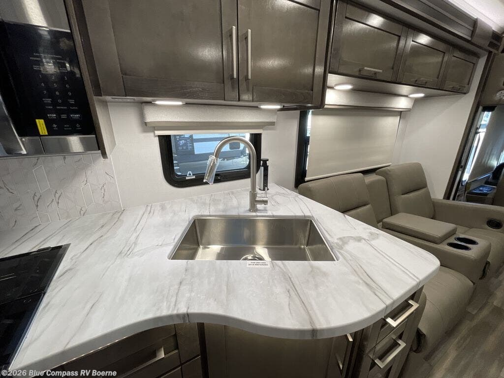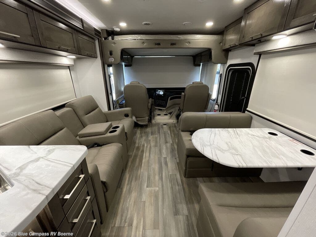 With any Alante Class A gas motorhome by Jayco, the mandatory Customer Value package provides JRide technology with a computer-balanced driveshaft ensuring smooth and efficient power transfer to the wheels, and SACHS shock absorbers offering independent adjustments to the road conditions. There is also a one-piece, seamless, crowned fiberglass roof, and an exterior entertainment center to watch shows and movies. The automatic hydraulic leveling jacks, 120 in. panoramic windshield, 200W solar panel, and the electric-powered entrance step will make traveling that much easier. And the interior equipment includes a Sony infotainment center with Apple CarPlay and Android Auto, a backup and side-view cameras for easy parking, plus a 6-way power driver seat for comfortable and safe driving. You will also love the power front privacy shade with manual side privacy shades, LED-lit hardwood fascia and countertops, a pop-up charging station in the kitchen and a USB port and wireless charging in the nightstands.