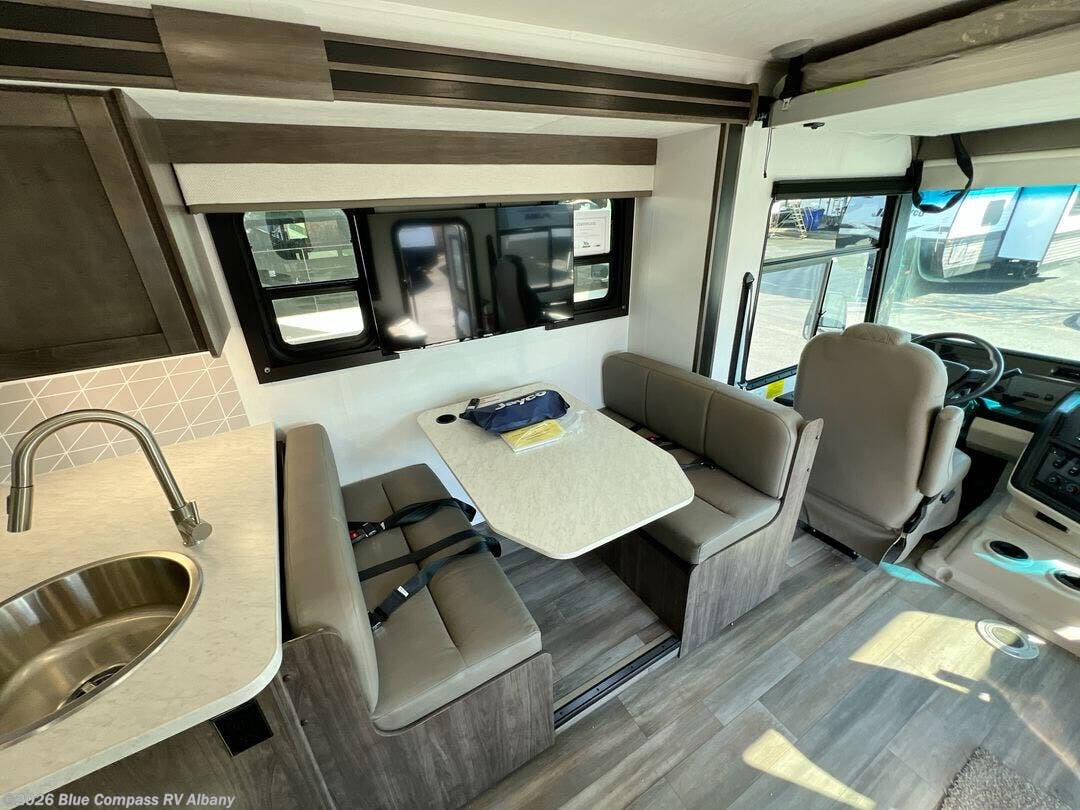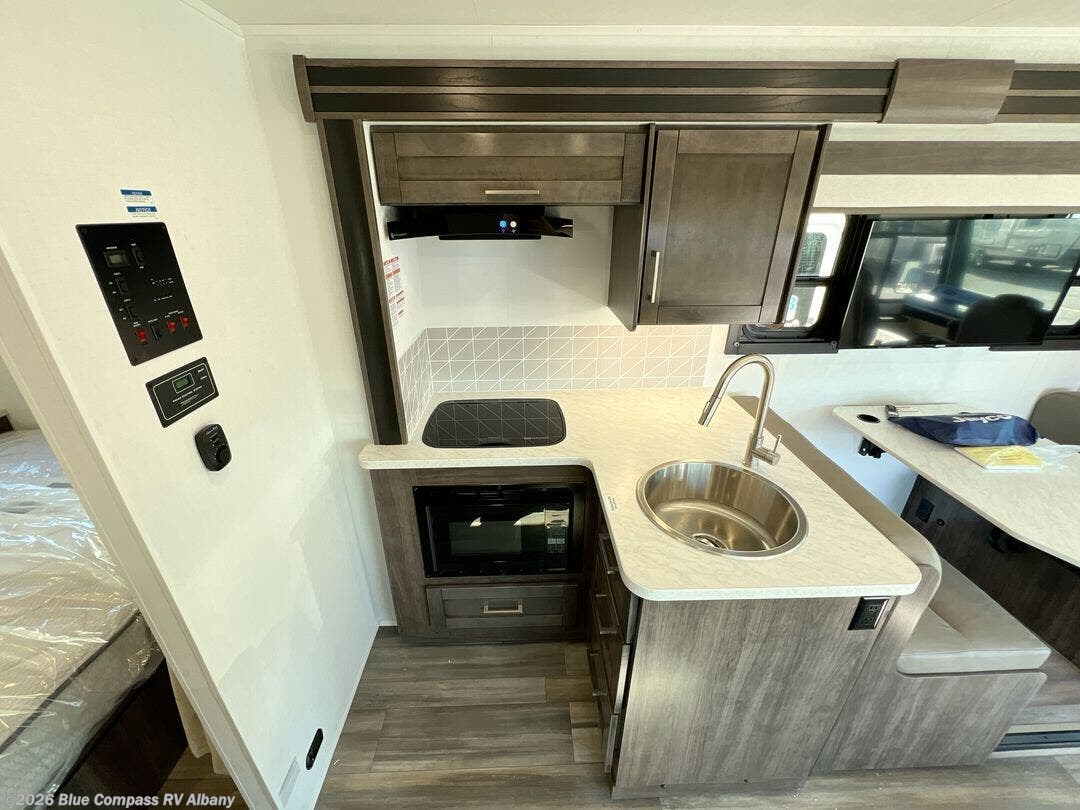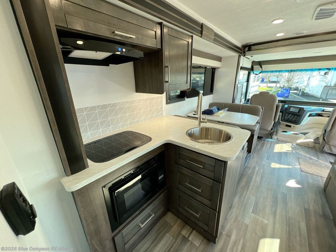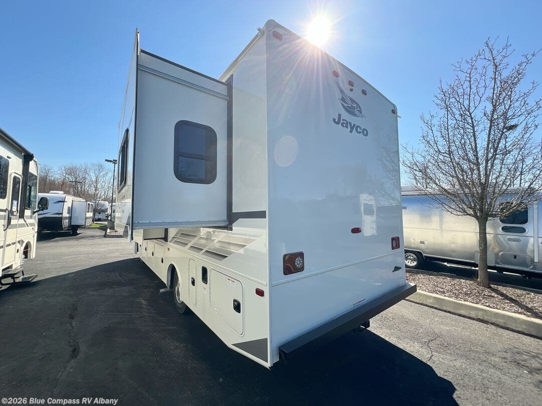 When you enjoy the drive as much as the destination, you know you made the correct choice for your adventures! The driver and passenger seats swivel to create more seating when you are parked, and the Jayco-exclusive, easy operation legless dinette table plus jack-knife sofa give everyone a place to relax and visit. You will also find sleeping space for five to six when you utilize the furniture and you choose the drop-down overhead bunk option. The rear corner bedroom gives you a king bed, two wardrobes, and a full bathroom just a few steps away. The kitchen offers full amenities including a two burner cooktop, a convection microwave, and a 10 cu. ft. 12V refrigerator. This unit also includes a 39" LED HD Smart TV in the living area to enjoy movie nights with popcorn!
