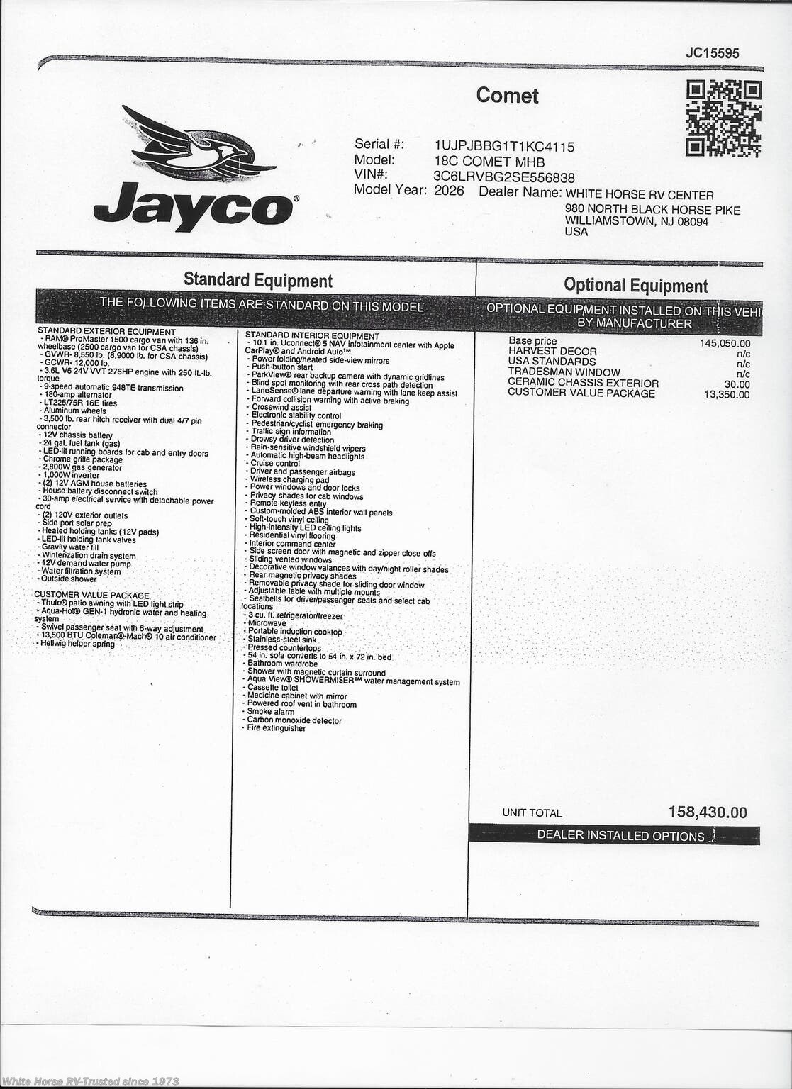 This Stock # JC15595 also has the following factory options included: Harvest Interior Decor, & Ceramic Chassis Exterior ... all backed by Jayco’s 2+3-year warranty. MSRP $158,430.00.