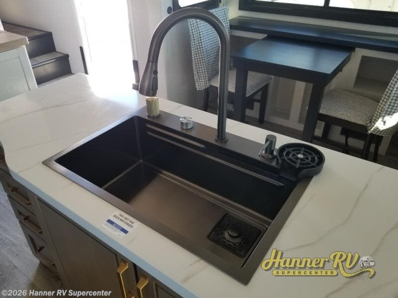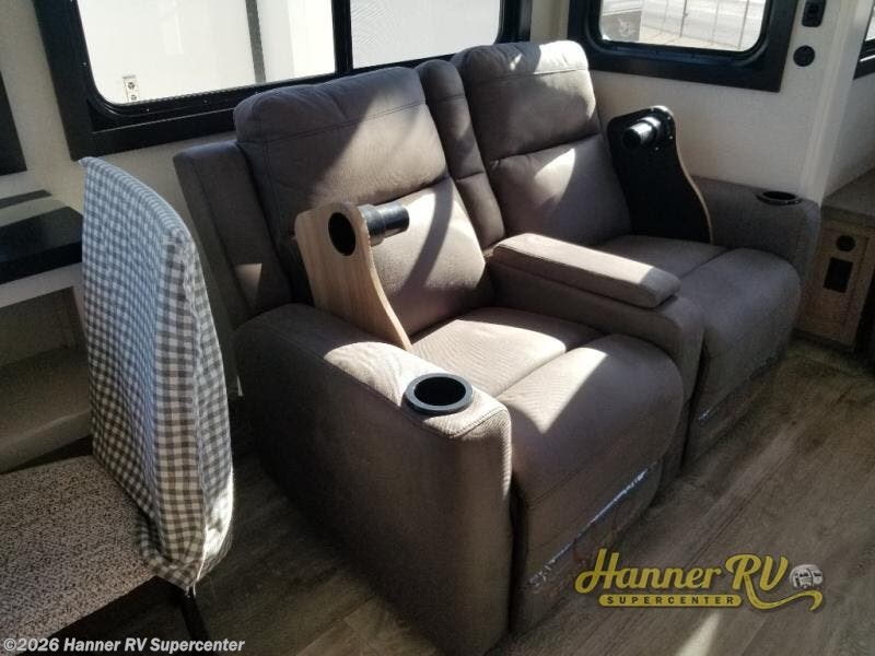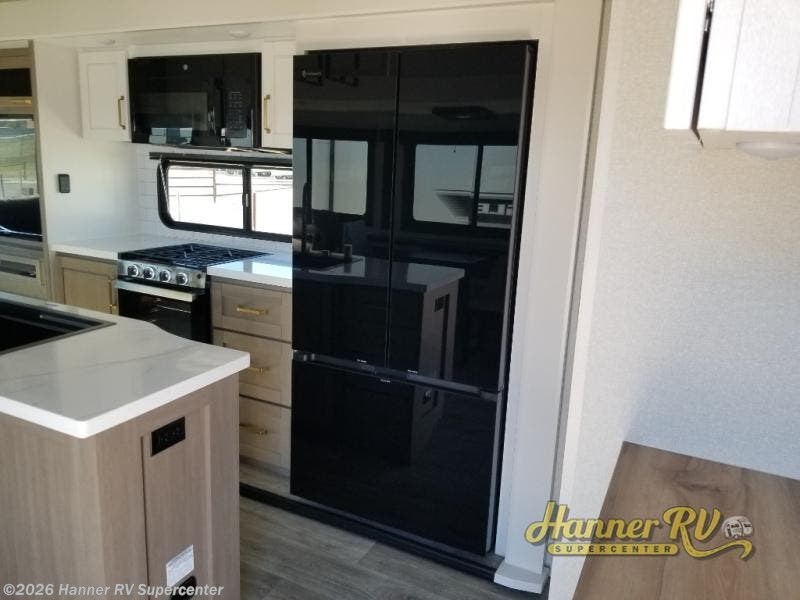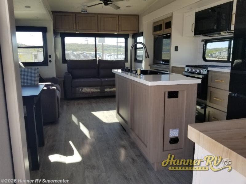 Triple slides for space, plenty of seating spaces, plus a spacious private bedroom make this fifth wheel one you won't want to pass up! You can freshen up each day in the full bath that includes a residential style glass shower door, a bathroom skylight, and a medicine cabinet to keep this space organized. Once you've cut up some fresh fruit at the kitchen island, whip up some eggs and bacon for breakfast, or just grab the cereal from the pantry. There is a spacious 16 cu. ft. 12V refrigerator, plus a hutch where you can store your own coffee machine. Relax on the tri-fold sofa, theater seat, or free-standing table with chairs/bench before heading out for the day. The king bed slide out in the front private bedroom will be waiting for you when you return!