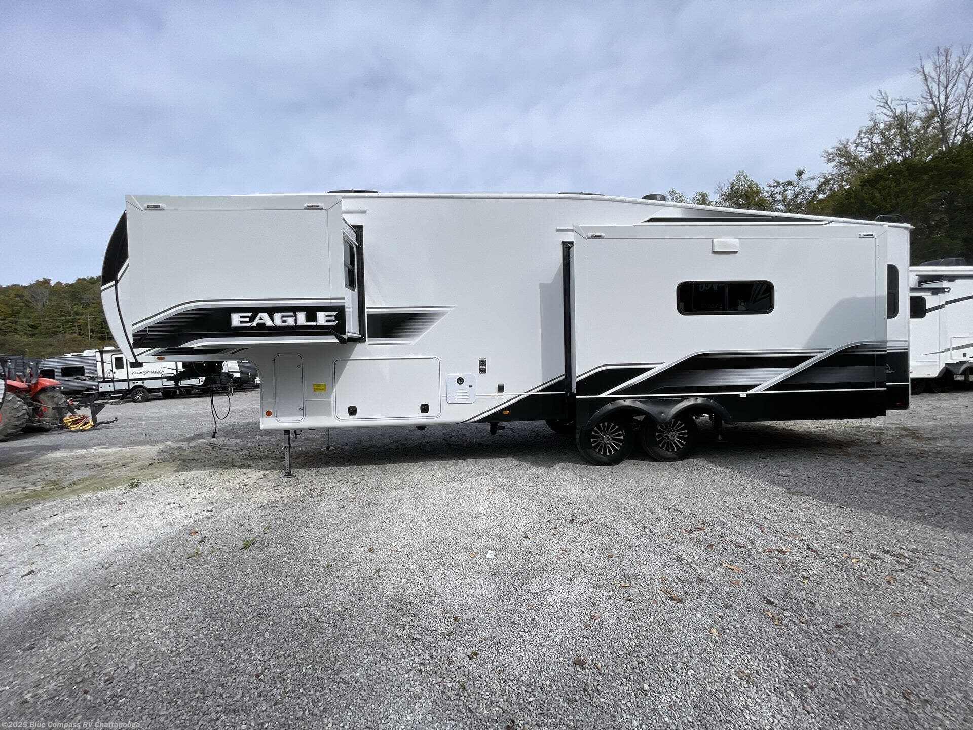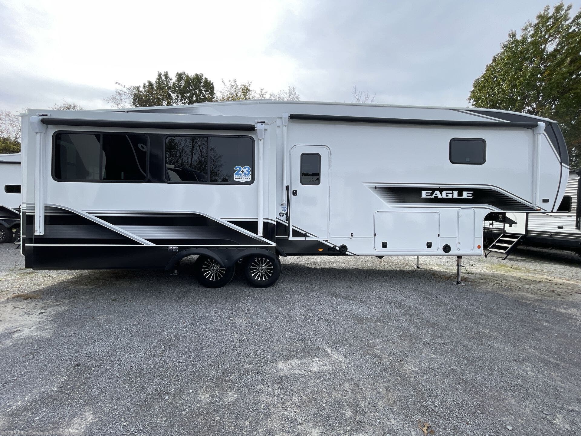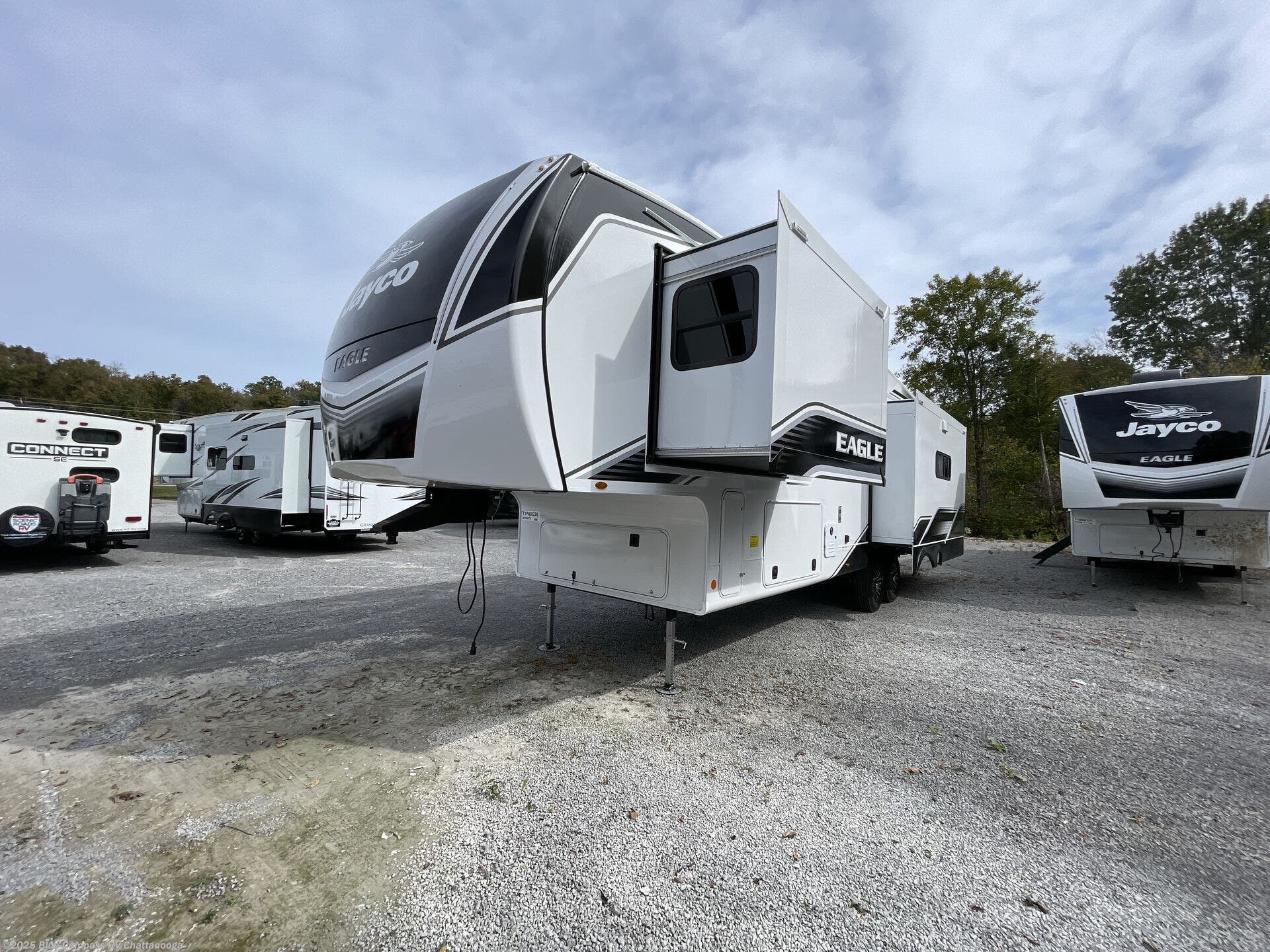 With any Eagle fifth wheel by Jayco you will appreciate durable construction materials, like the Magnum Truss Roof and the Stronghold VBL laminated walls. The JAYCOMMAND Smart RV system puts you in control of your RV's functions, and the 5 Star Handling Package will provide smooth towing from home to camp. Each model features Climate Shield zero-degree tested weather protection and the industry-exclusive HELIX cooling system that features two 15,000 BTU Whisper Quiet A/C's to keep you comfortable year around. Some of the exterior conveniences you are sure to love are the pass-through storage with Slam-Latch baggage doors and an automotive style front cap with max turn radius. The Eagle fifth wheels are designed to make you feel at home with solid hardwood slide fascia, residential vinyl flooring throughout, 100% no floor vents, and blackout roller shades with reflective side throughout for added privacy and insulation.