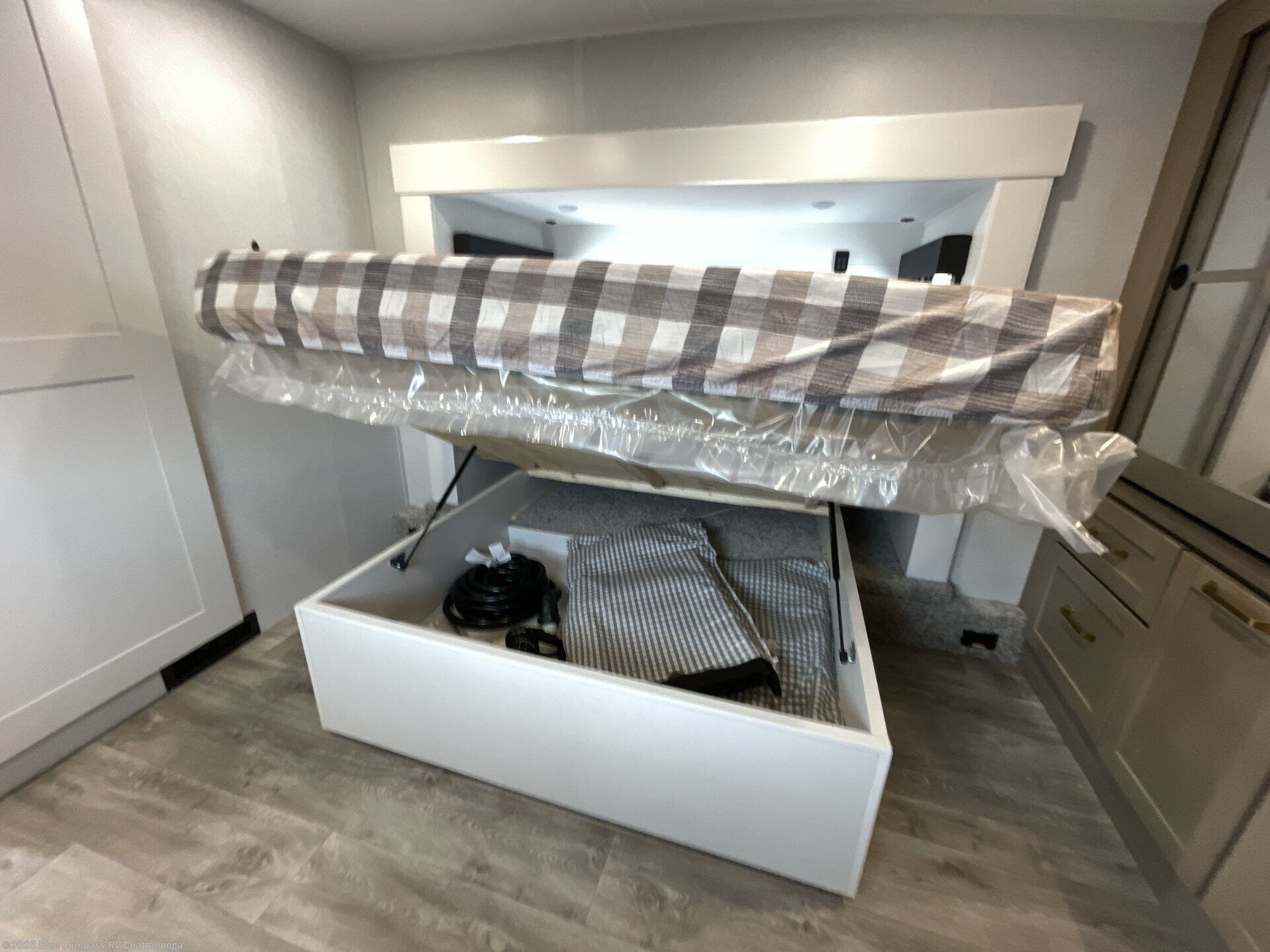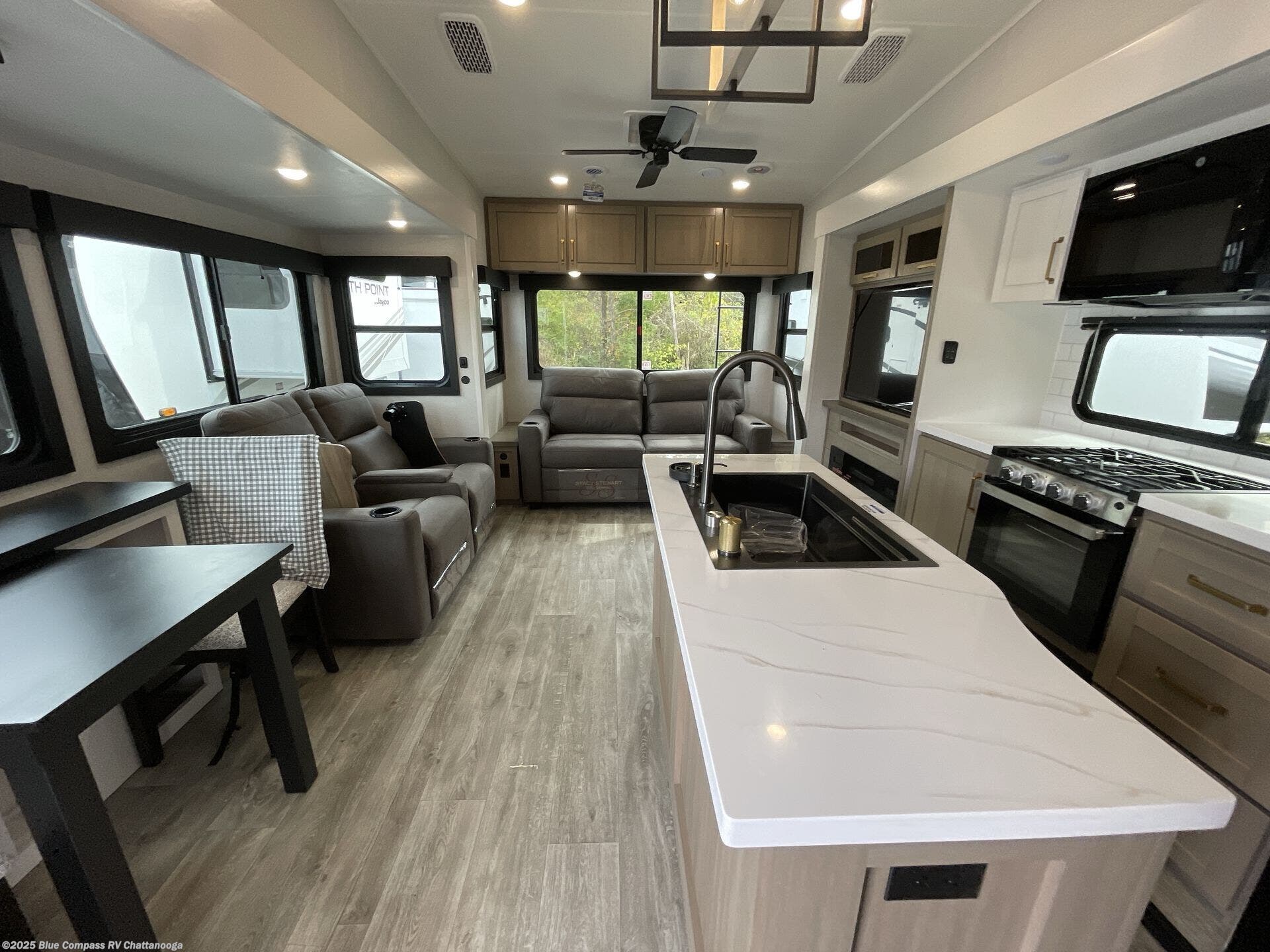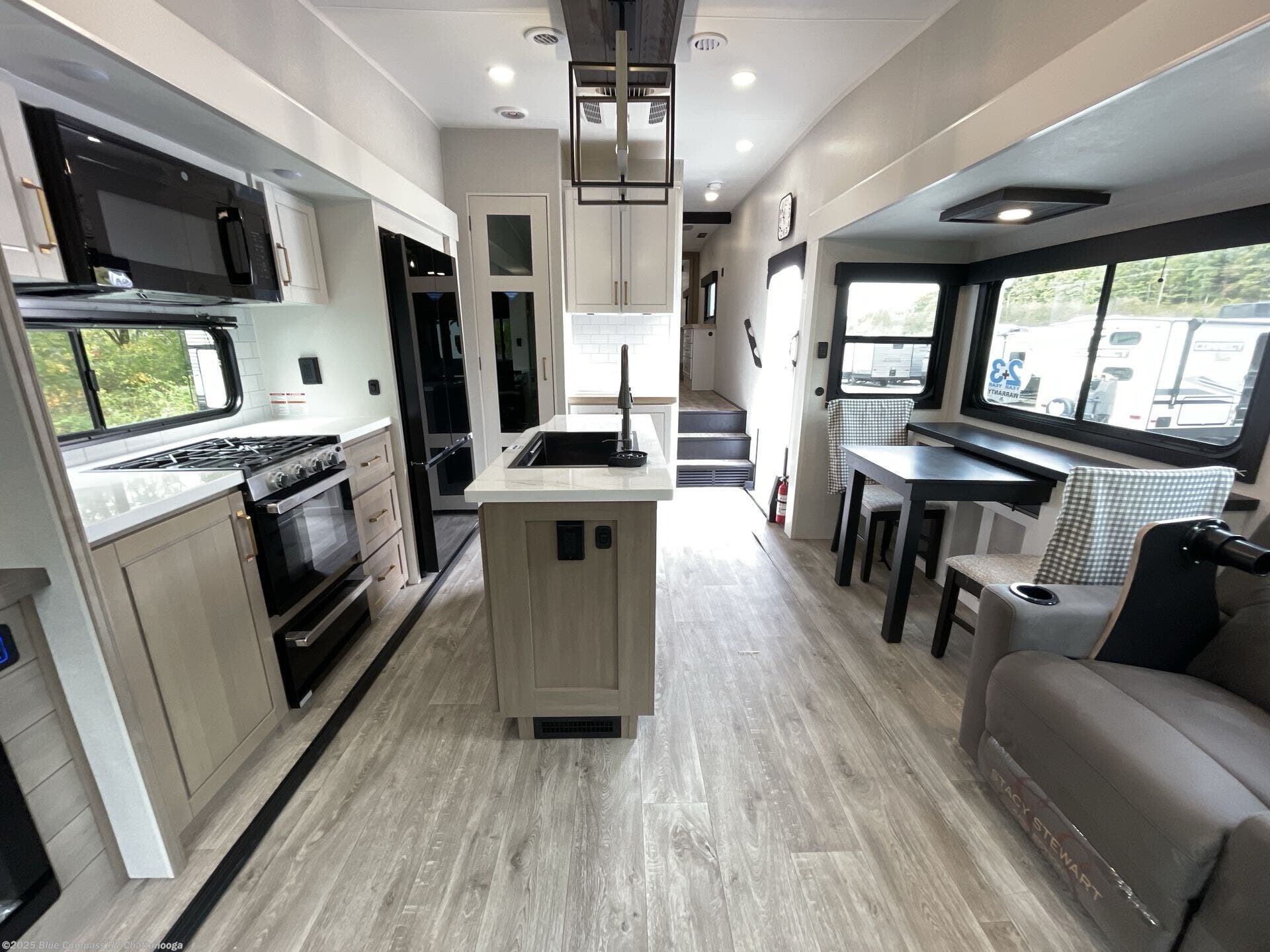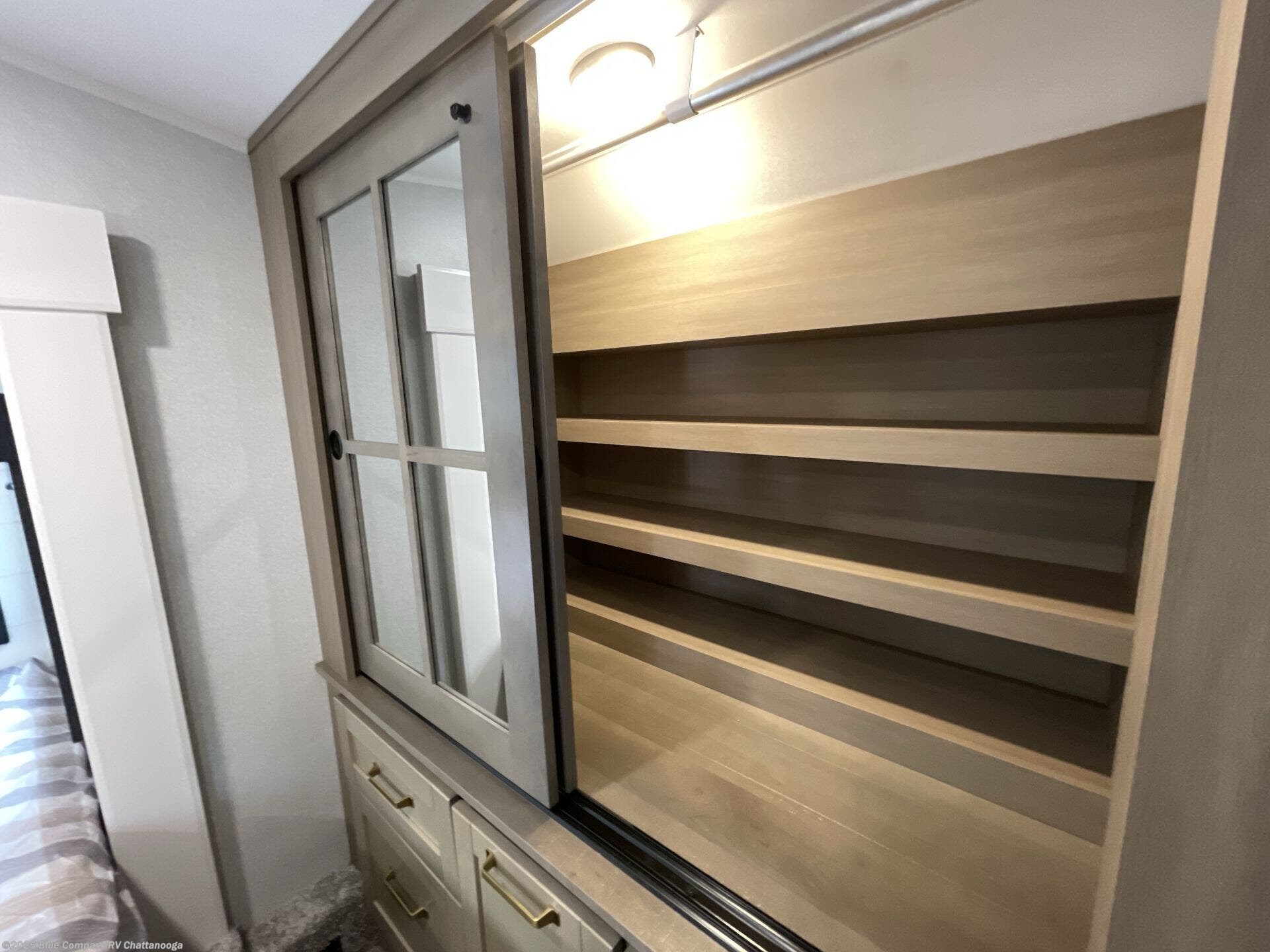 Triple slides for space, plenty of seating spaces, plus a spacious private bedroom make this fifth wheel one you won't want to pass up! You can freshen up each day in the full bath that includes a residential style glass shower door, a bathroom skylight, and a medicine cabinet to keep this space organized. Once you've cut up some fresh fruit at the kitchen island, whip up some eggs and bacon for breakfast, or just grab the cereal from the pantry. There is a spacious 16 cu. ft. 12V refrigerator, plus a hutch where you can store your own coffee machine. Relax on the tri-fold sofa, theater seat, or free-standing table with chairs/bench before heading out for the day. The king bed slide out in the front private bedroom will be waiting for you when you return!