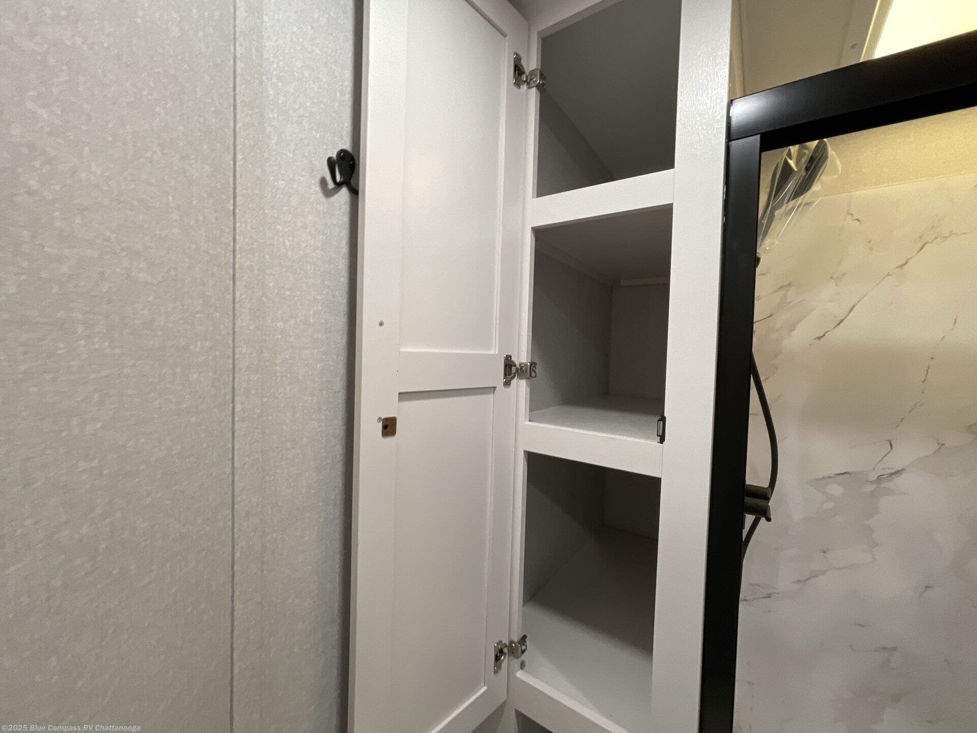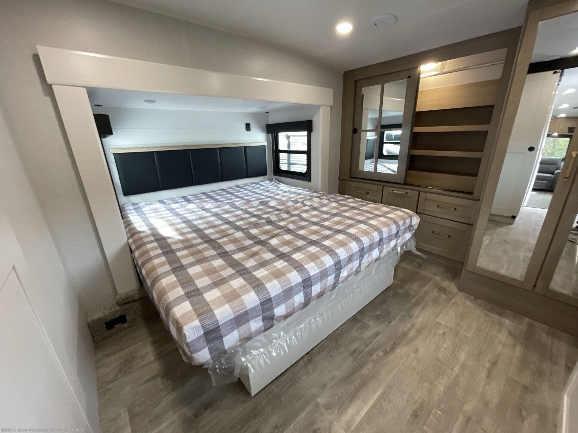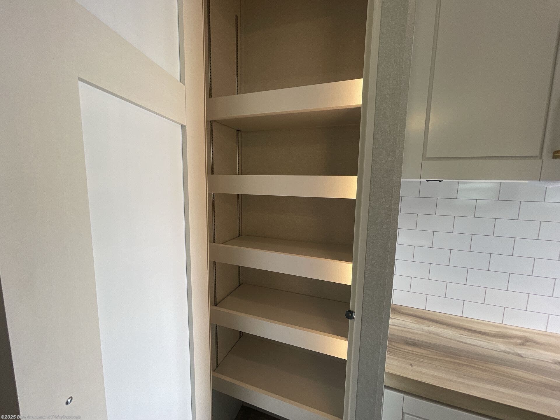 Triple slides for space, plenty of seating spaces, plus a spacious private bedroom make this fifth wheel one you won't want to pass up! You can freshen up each day in the full bath that includes a residential style glass shower door, a bathroom skylight, and a medicine cabinet to keep this space organized. Once you've cut up some fresh fruit at the kitchen island, whip up some eggs and bacon for breakfast, or just grab the cereal from the pantry. There is a spacious 16 cu. ft. 12V refrigerator, plus a hutch where you can store your own coffee machine. Relax on the tri-fold sofa, theater seat, or free-standing table with chairs/bench before heading out for the day. The king bed slide out in the front private bedroom will be waiting for you when you return!