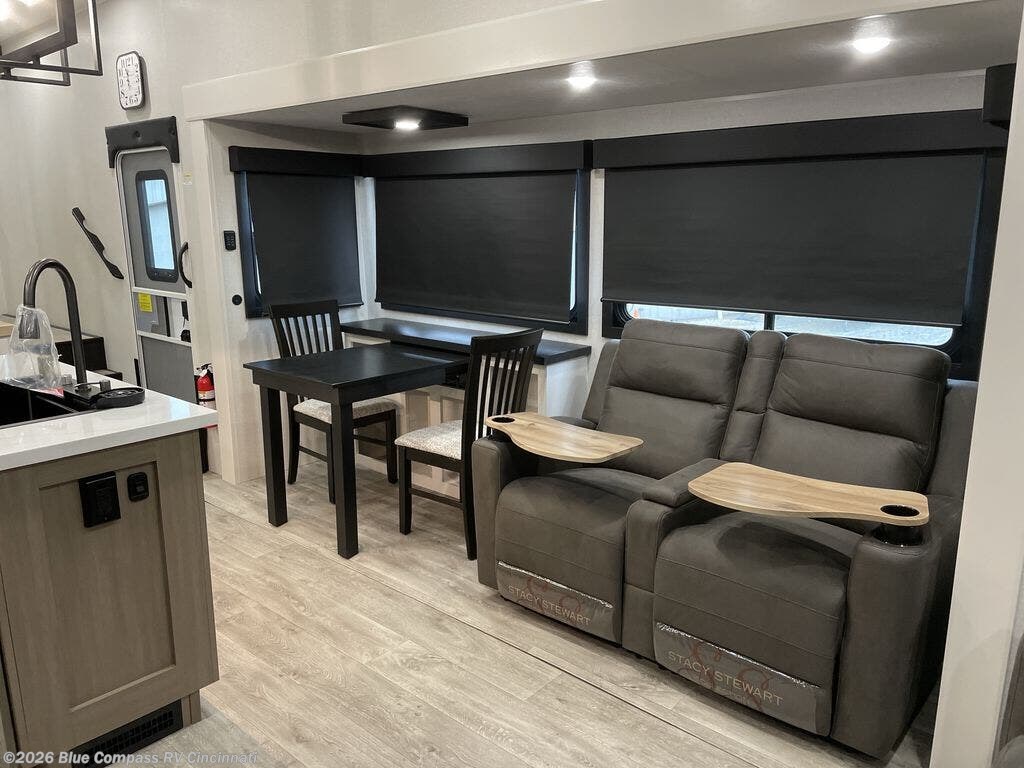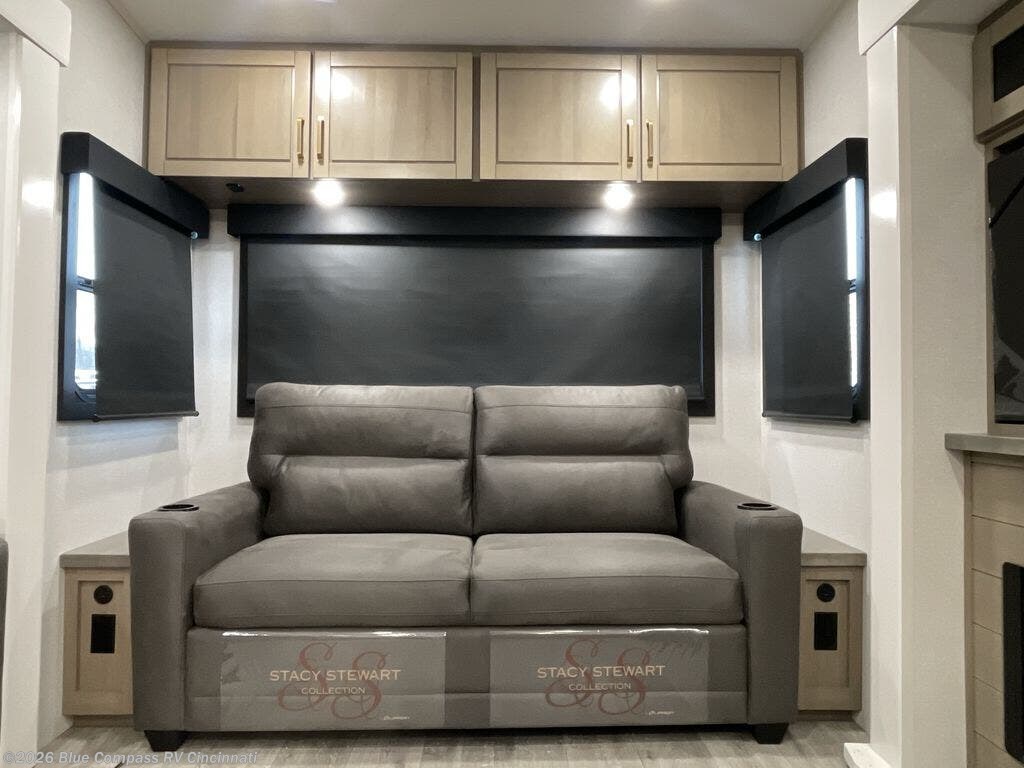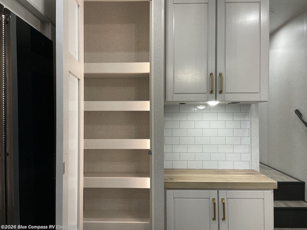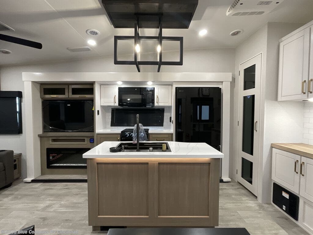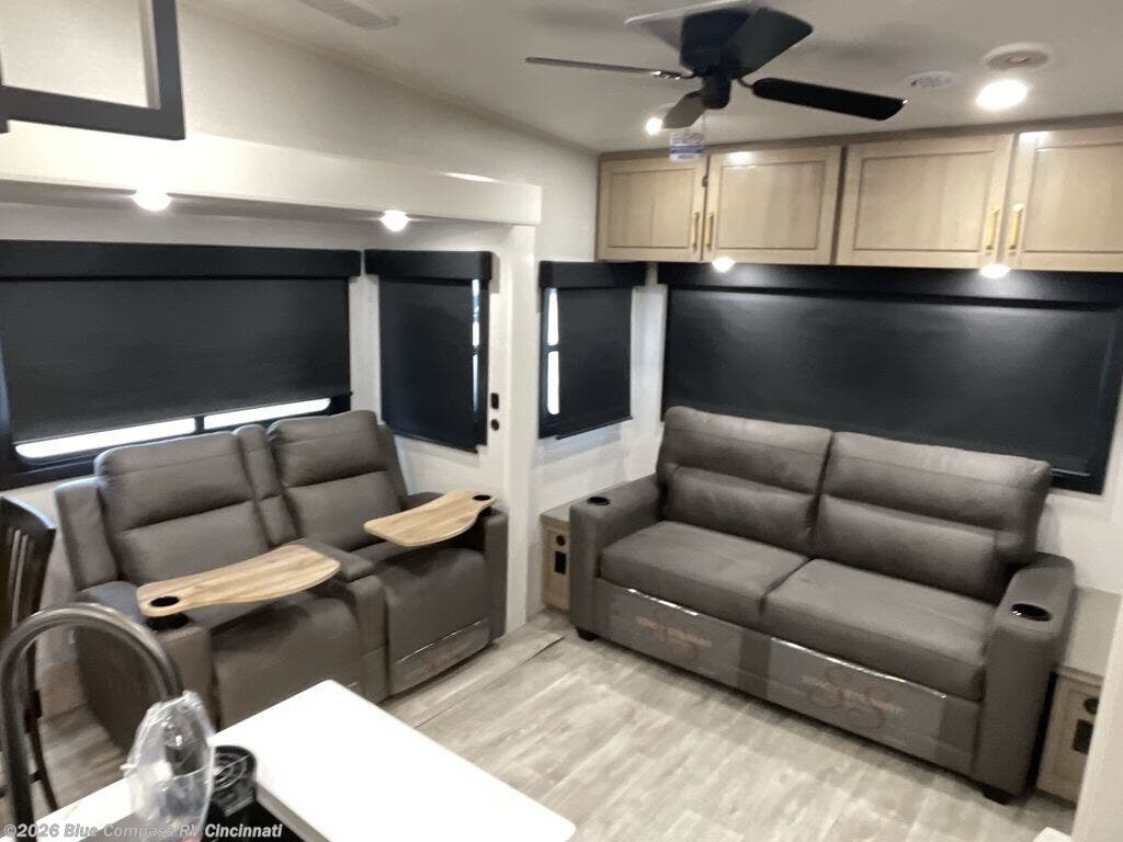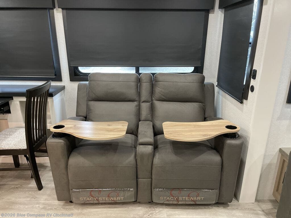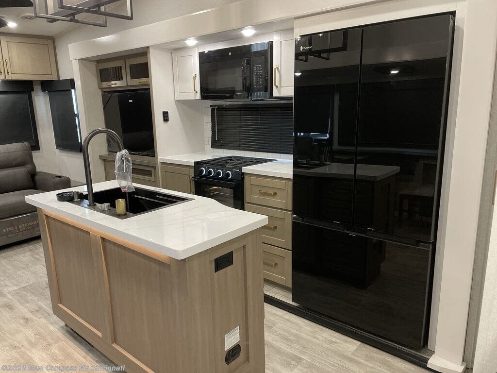 Triple slides for space, plenty of seating spaces, plus a spacious private bedroom make this fifth wheel one you won't want to pass up! You can freshen up each day in the full bath that includes a residential style glass shower door, a bathroom skylight, and a medicine cabinet to keep this space organized. Once you've cut up some fresh fruit at the kitchen island, whip up some eggs and bacon for breakfast, or just grab the cereal from the pantry. There is a spacious 16 cu. ft. 12V refrigerator, plus a hutch where you can store your own coffee machine. Relax on the tri-fold sofa, theater seat, or free-standing table with chairs/bench before heading out for the day. The king bed slide out in the front private bedroom will be waiting for you when you return!