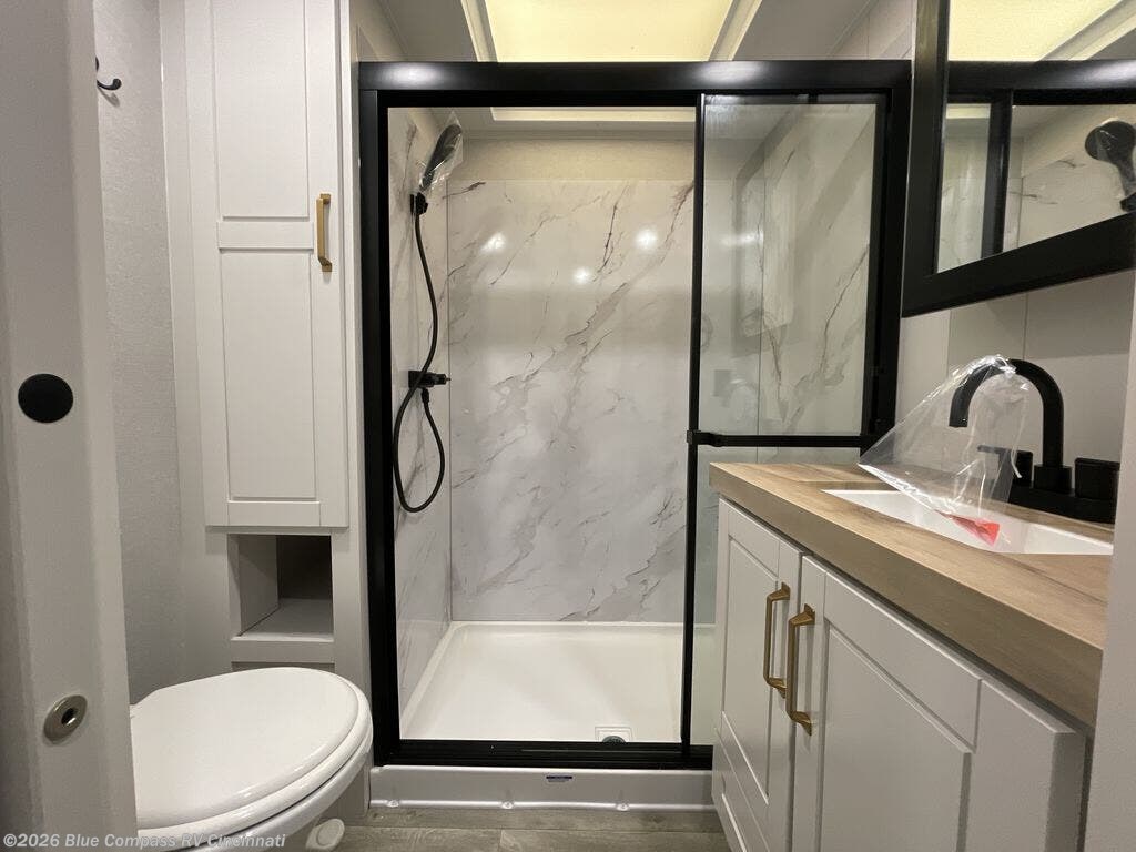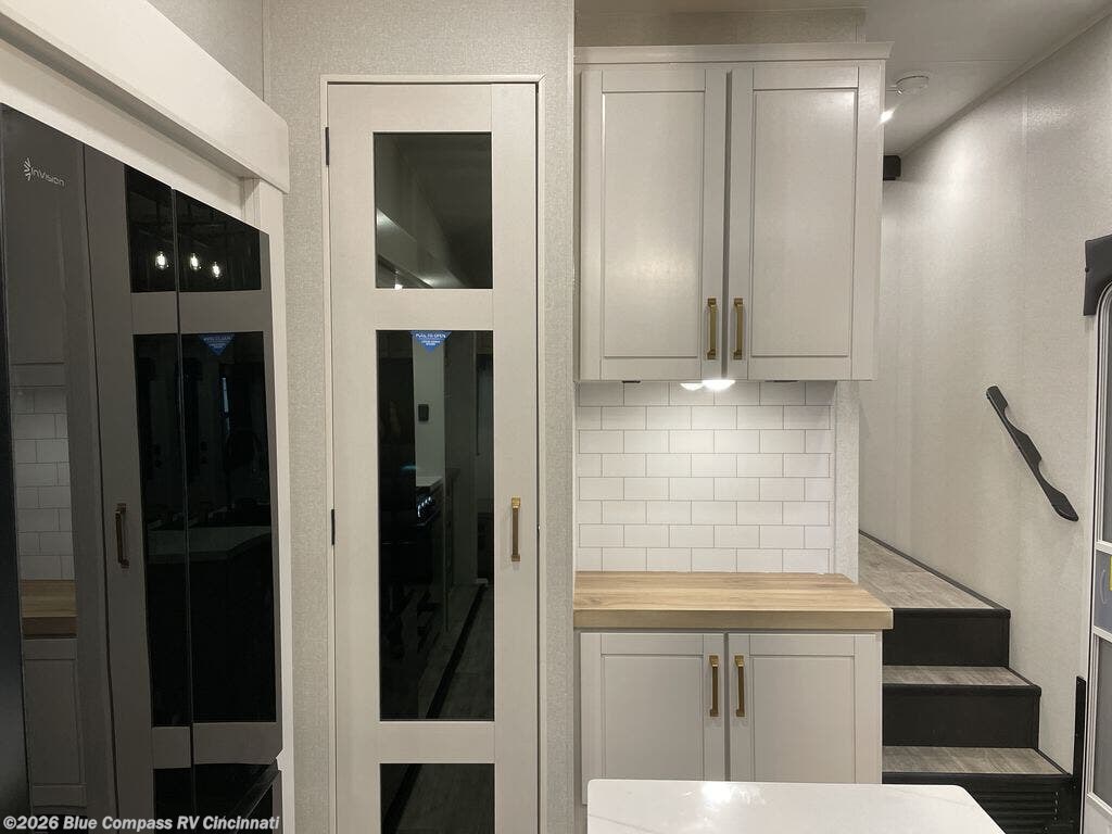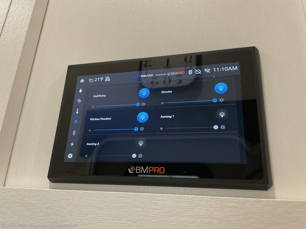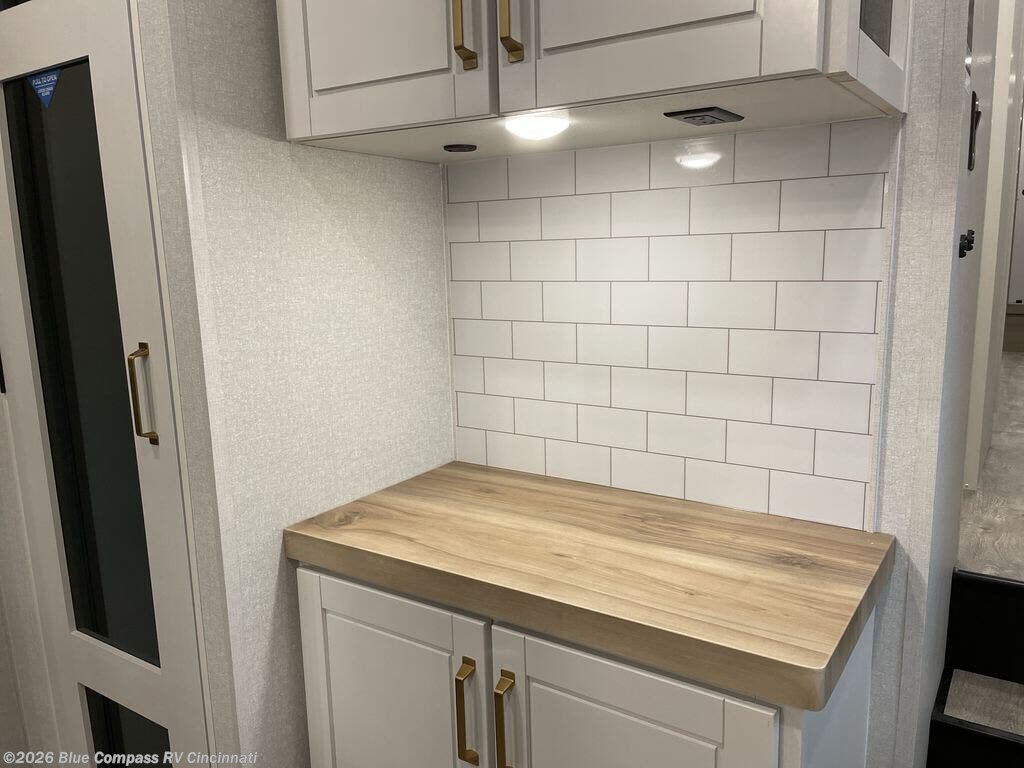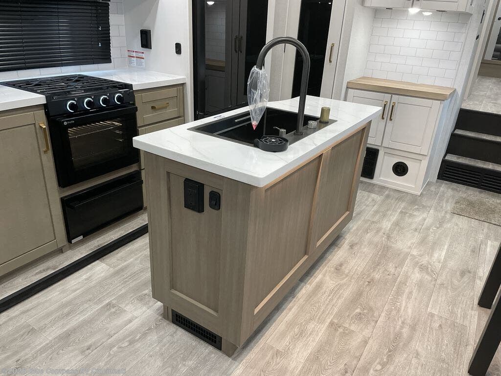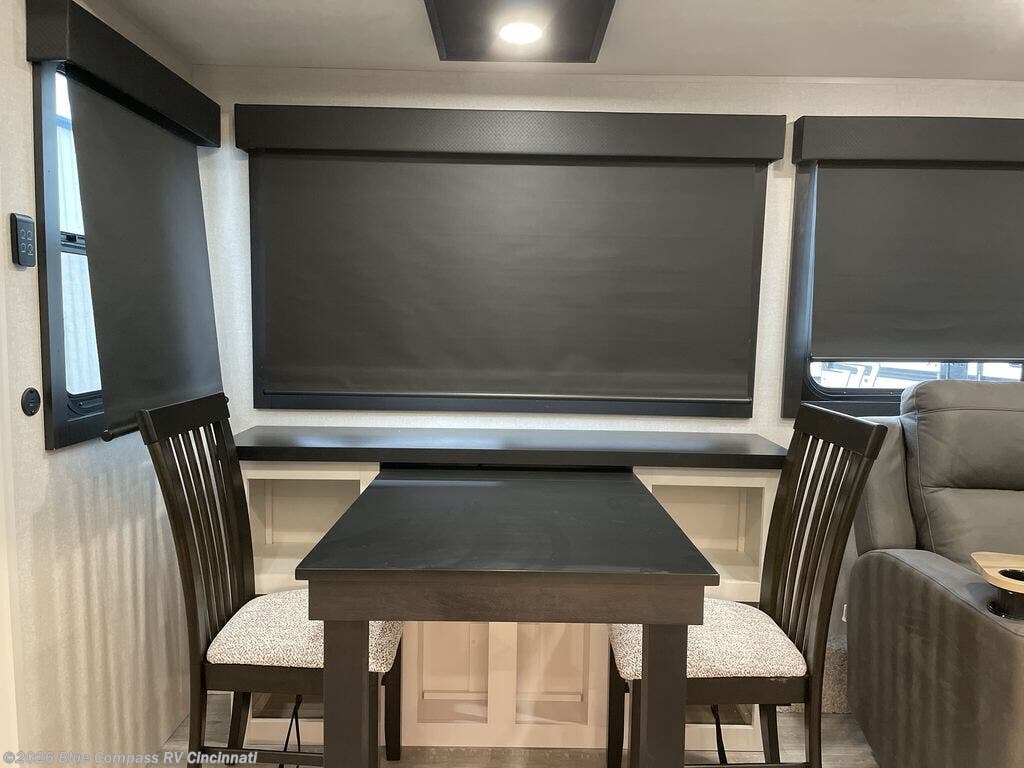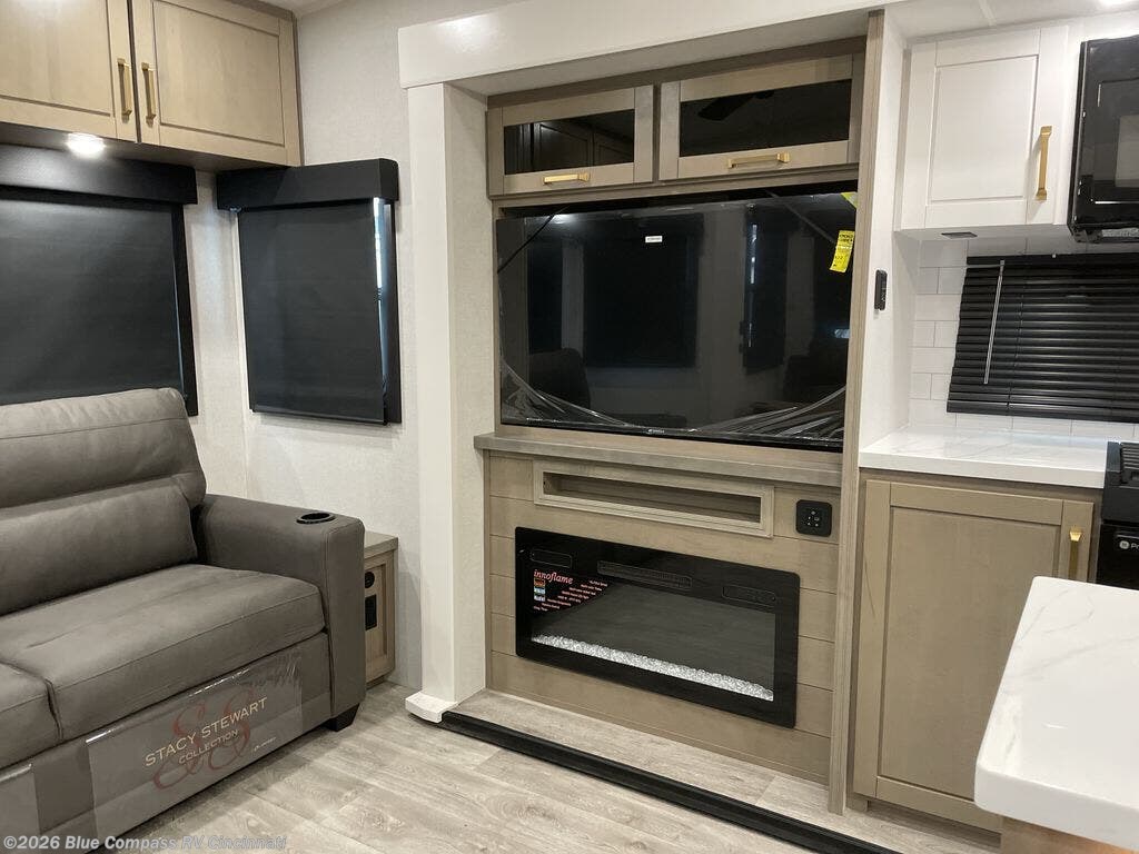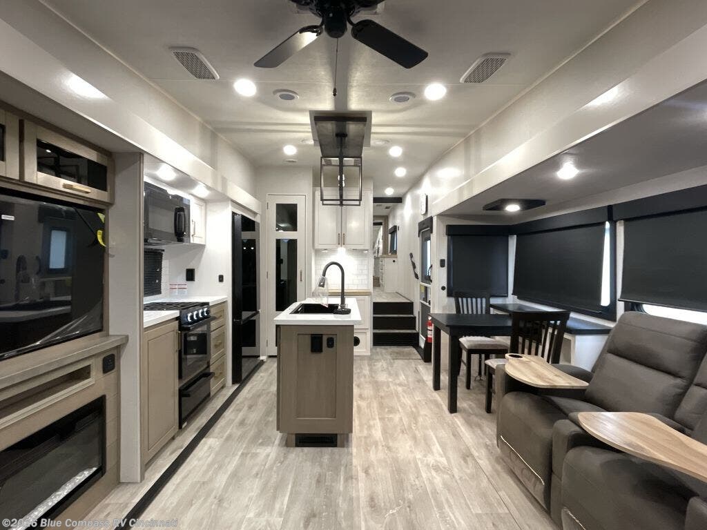 Triple slides for space, plenty of seating spaces, plus a spacious private bedroom make this fifth wheel one you won't want to pass up! You can freshen up each day in the full bath that includes a residential style glass shower door, a bathroom skylight, and a medicine cabinet to keep this space organized. Once you've cut up some fresh fruit at the kitchen island, whip up some eggs and bacon for breakfast, or just grab the cereal from the pantry. There is a spacious 16 cu. ft. 12V refrigerator, plus a hutch where you can store your own coffee machine. Relax on the tri-fold sofa, theater seat, or free-standing table with chairs/bench before heading out for the day. The king bed slide out in the front private bedroom will be waiting for you when you return!