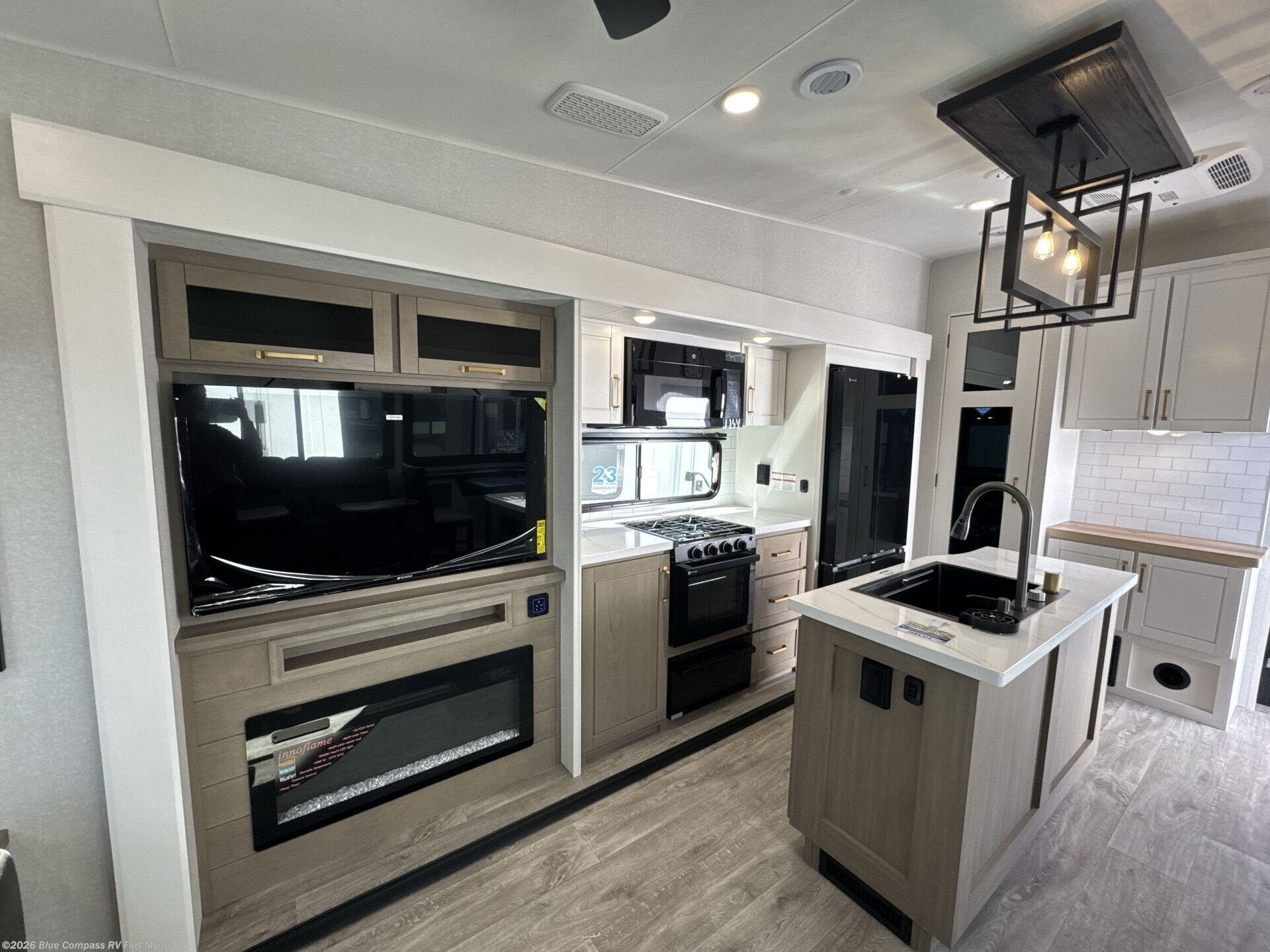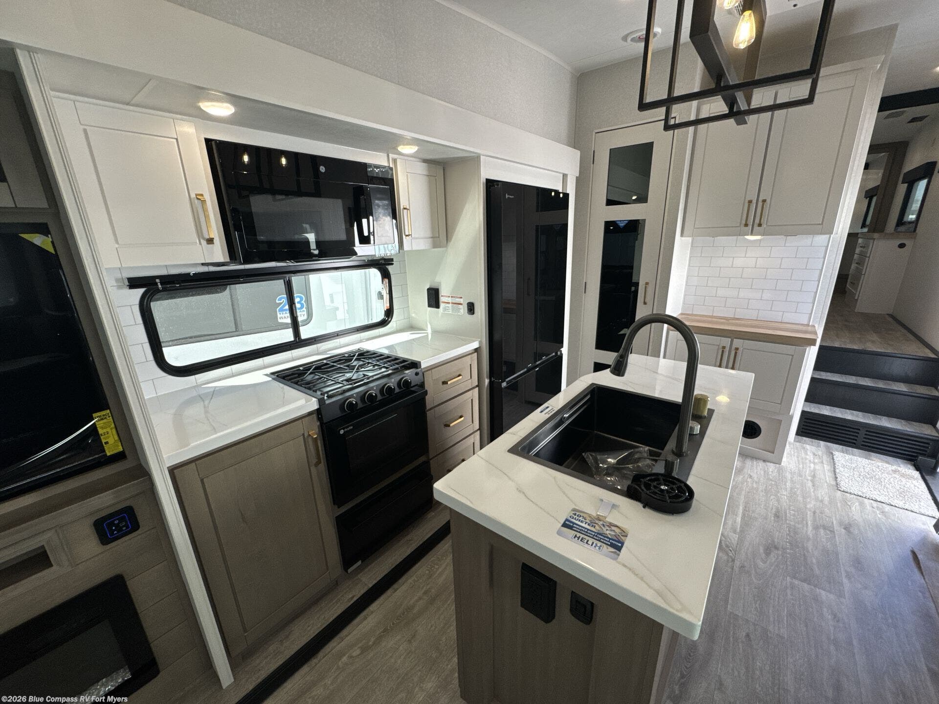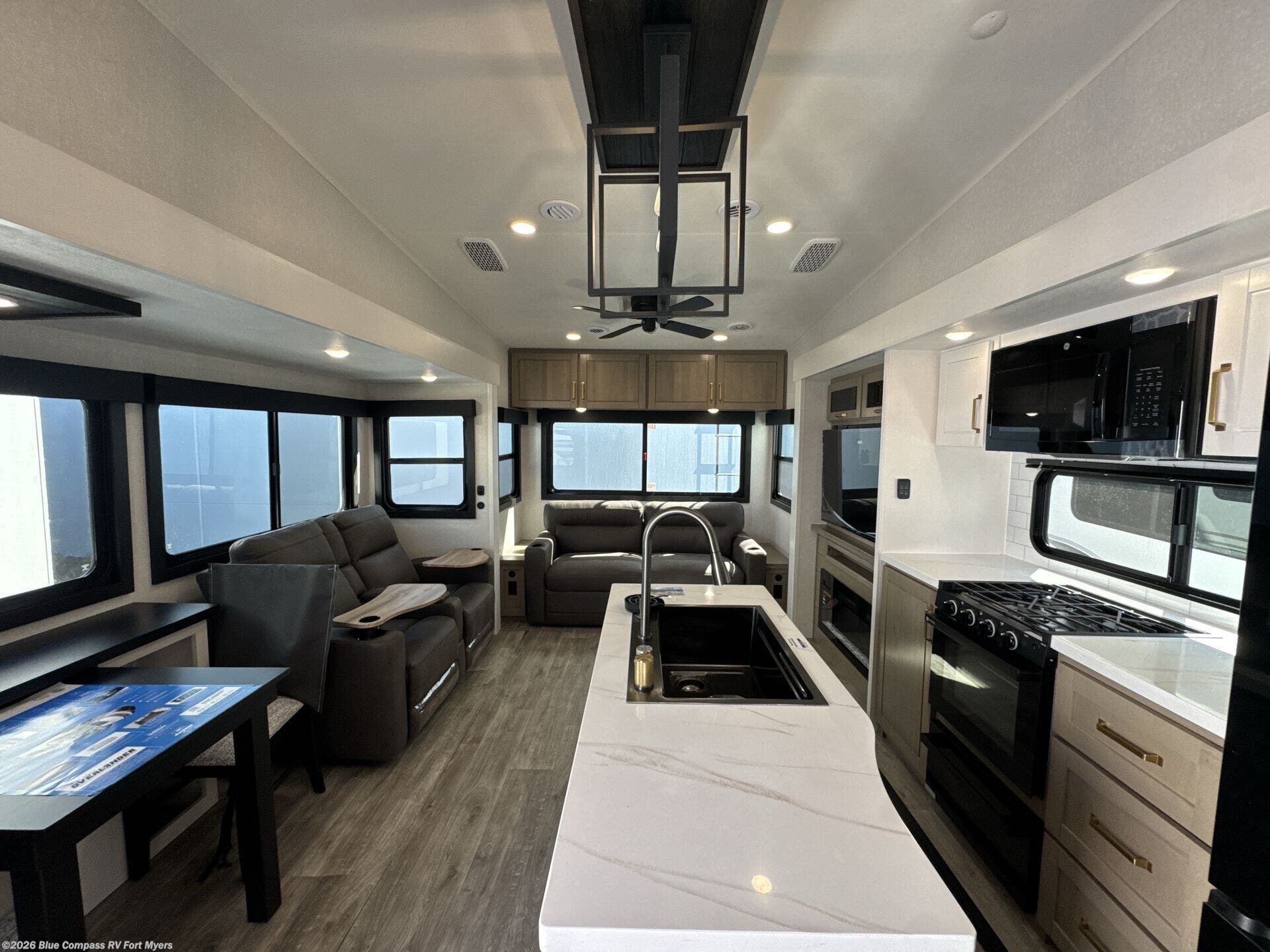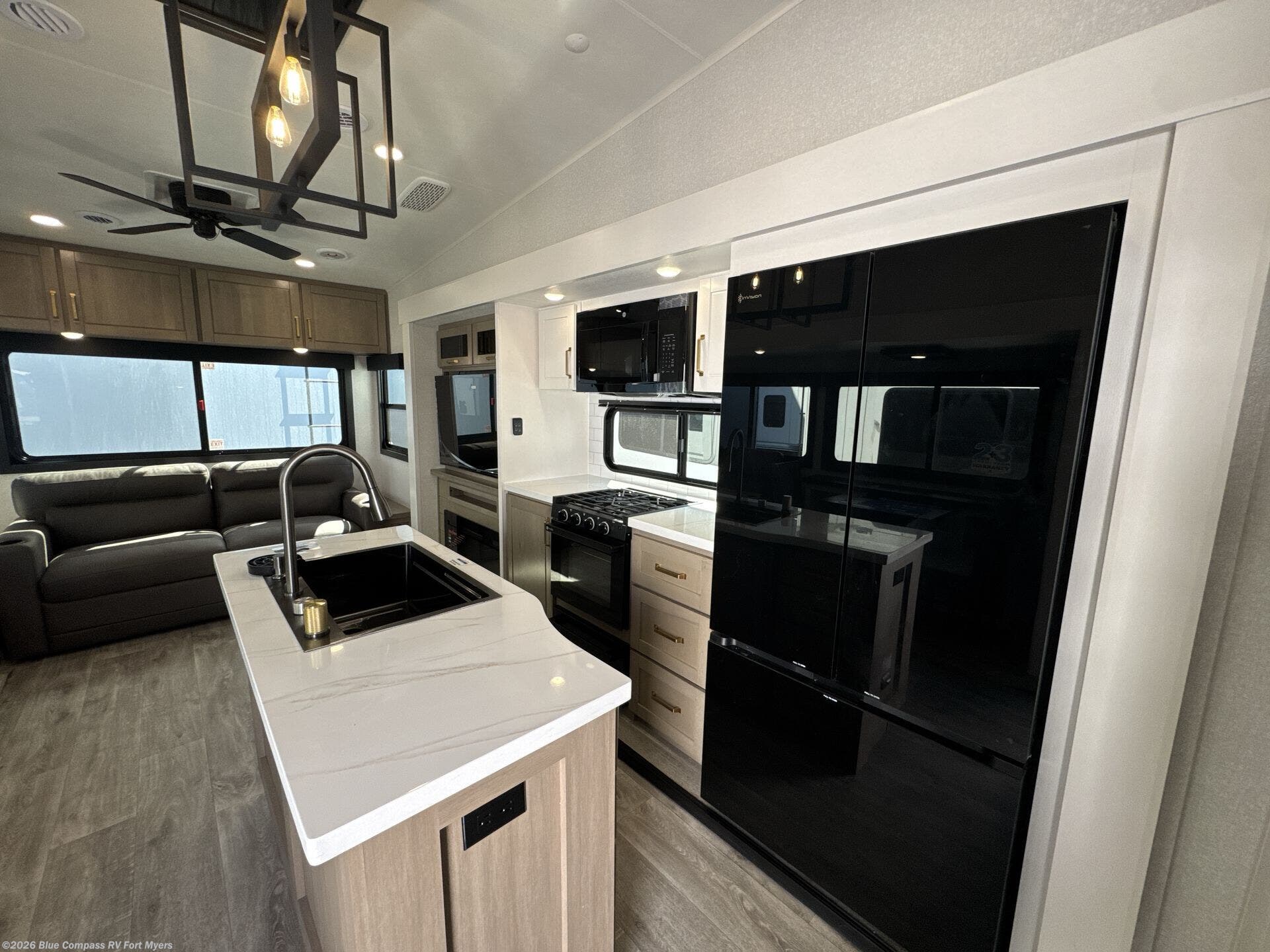 Triple slides for space, plenty of seating spaces, plus a spacious private bedroom make this fifth wheel one you won't want to pass up! You can freshen up each day in the full bath that includes a residential style glass shower door, a bathroom skylight, and a medicine cabinet to keep this space organized. Once you've cut up some fresh fruit at the kitchen island, whip up some eggs and bacon for breakfast, or just grab the cereal from the pantry. There is a spacious 16 cu. ft. 12V refrigerator, plus a hutch where you can store your own coffee machine. Relax on the tri-fold sofa, theater seat, or roll top dinette table with chairs before heading out for the day. The king bed slide out in the front private bedroom will be waiting for you when you return!