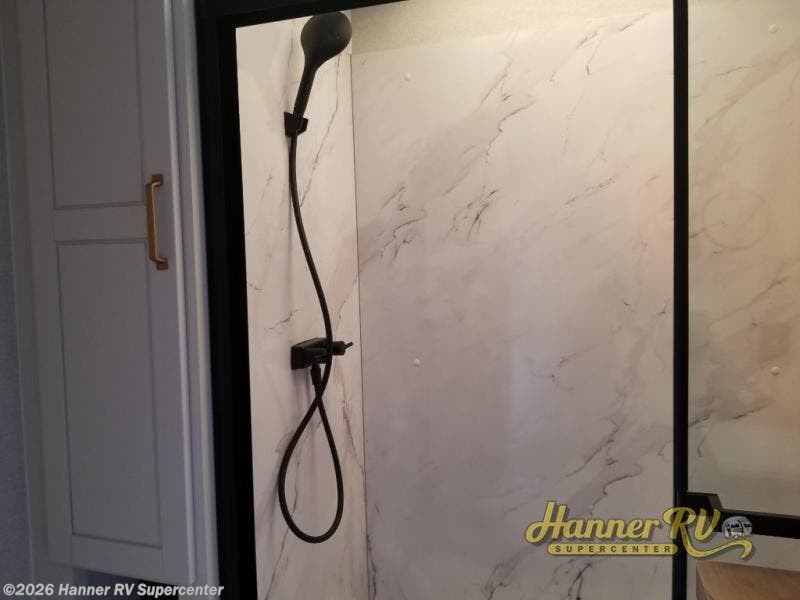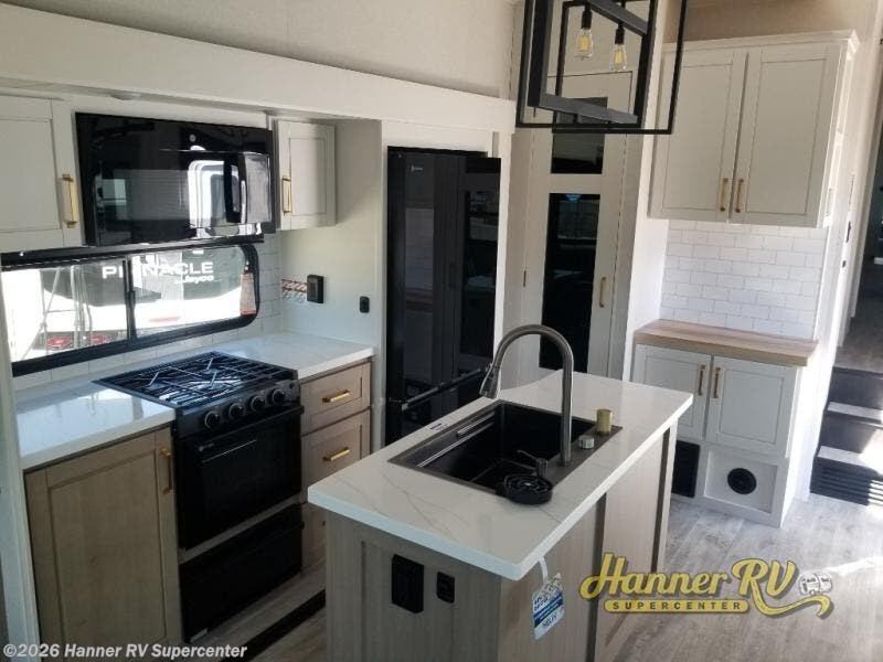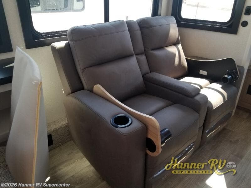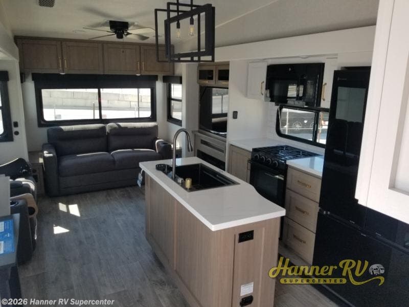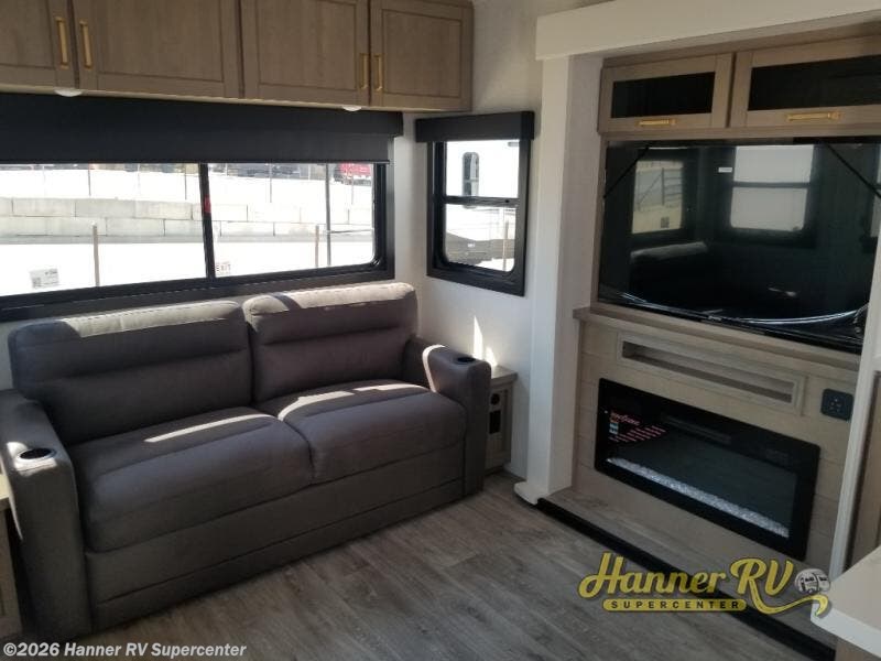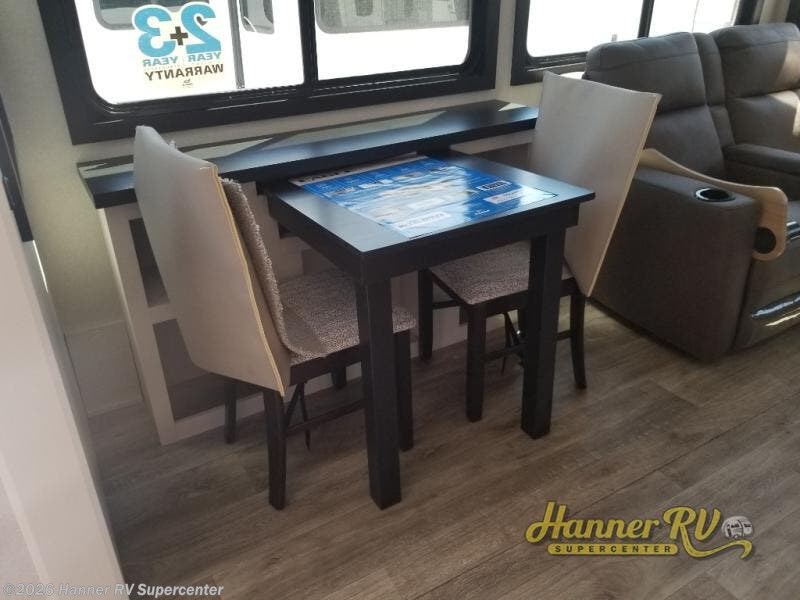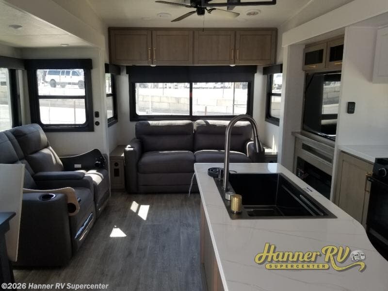 Triple slides for space, plenty of seating spaces, plus a spacious private bedroom make this fifth wheel one you won't want to pass up! You can freshen up each day in the full bath that includes a residential style glass shower door, a bathroom skylight, and a medicine cabinet to keep this space organized. Once you've cut up some fresh fruit at the kitchen island, whip up some eggs and bacon for breakfast, or just grab the cereal from the pantry. There is a spacious 16 cu. ft. 12V refrigerator, plus a hutch where you can store your own coffee machine. Relax on the tri-fold sofa, theater seat, or roll top dinette table with chairs before heading out for the day. The king bed slide out in the front private bedroom will be waiting for you when you return!