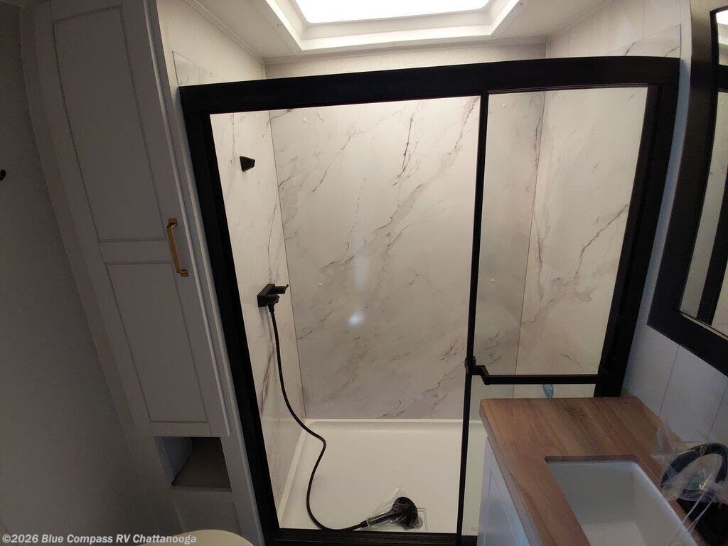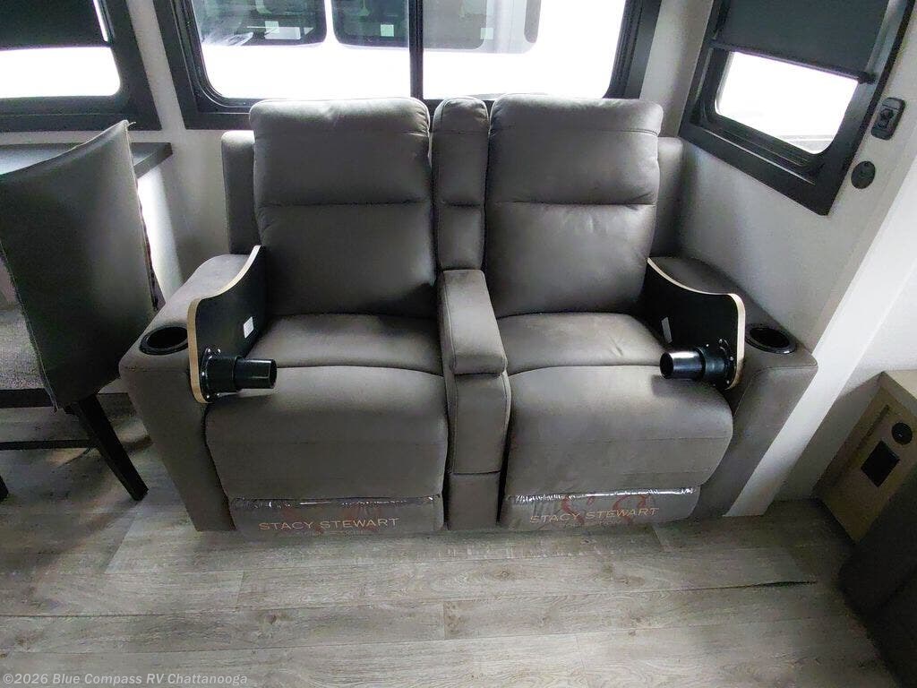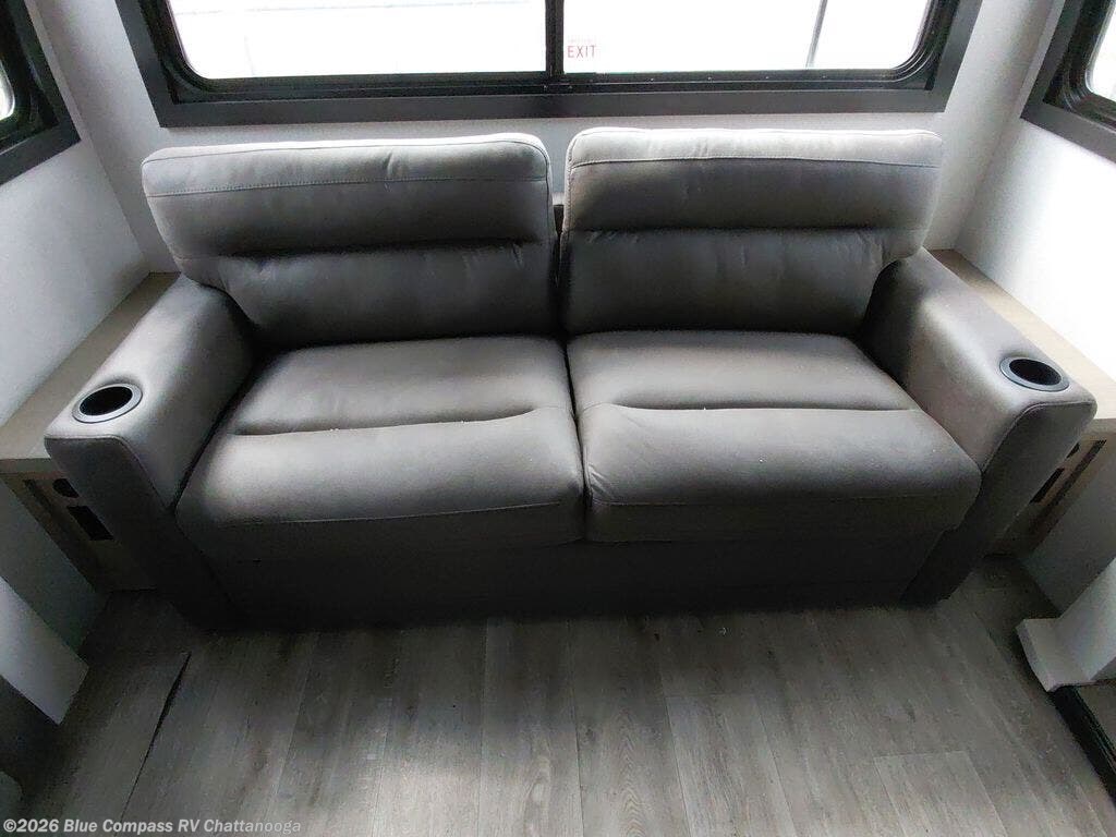 Triple slides for space, plenty of seating spaces, plus a spacious private bedroom make this fifth wheel one you won't want to pass up! You can freshen up each day in the full bath that includes a residential style glass shower door, a bathroom skylight, and a medicine cabinet to keep this space organized. Once you've cut up some fresh fruit at the kitchen island, whip up some eggs and bacon for breakfast, or just grab the cereal from the pantry. There is a spacious 16 cu. ft. 12V refrigerator, plus a hutch where you can store your own coffee machine. Relax on the tri-fold sofa, theater seat, or roll top dinette table with chairs before heading out for the day. The king bed slide out in the front private bedroom will be waiting for you when you return!