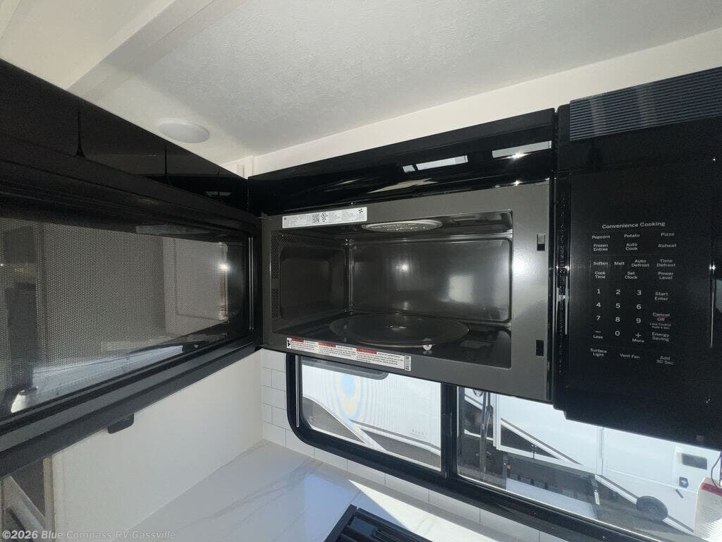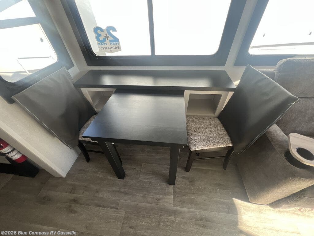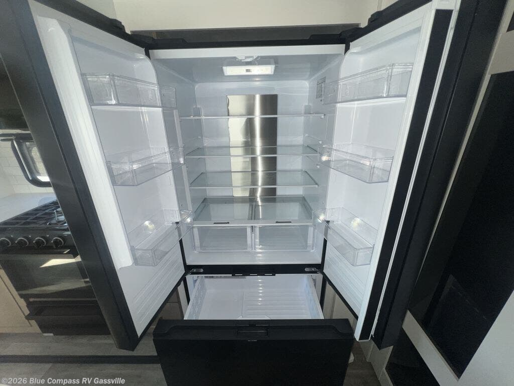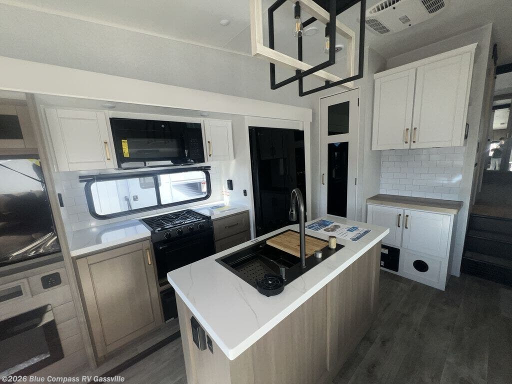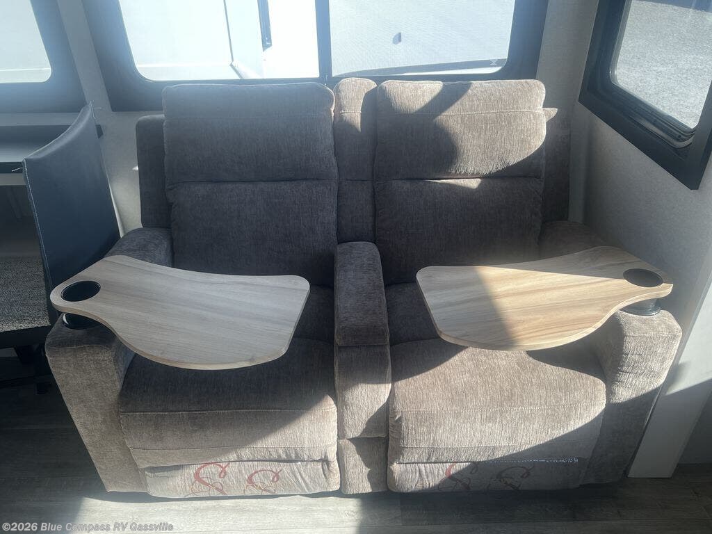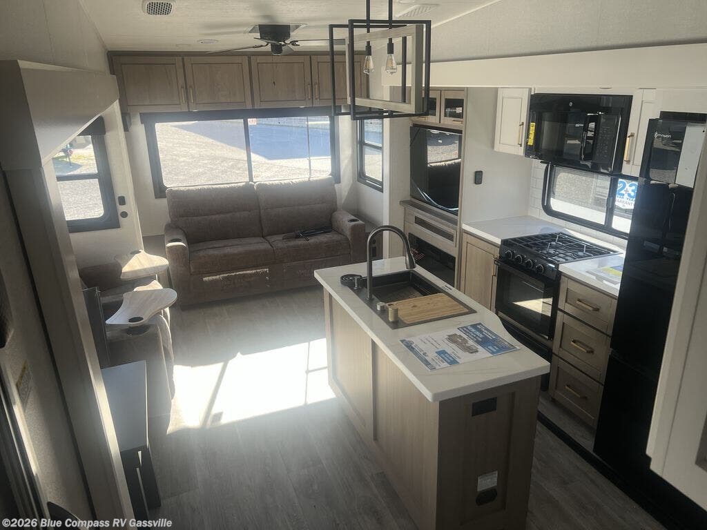 Triple slides for space, plenty of seating spaces, plus a spacious private bedroom make this fifth wheel one you won't want to pass up! You can freshen up each day in the full bath that includes a residential style glass shower door, a bathroom skylight, and a medicine cabinet to keep this space organized. Once you've cut up some fresh fruit at the kitchen island, whip up some eggs and bacon for breakfast, or just grab the cereal from the pantry. There is a spacious 16 cu. ft. 12V refrigerator, plus a hutch where you can store your own coffee machine. Relax on the tri-fold sofa, theater seat, or roll top dinette table with chairs before heading out for the day. The king bed slide out in the front private bedroom will be waiting for you when you return!