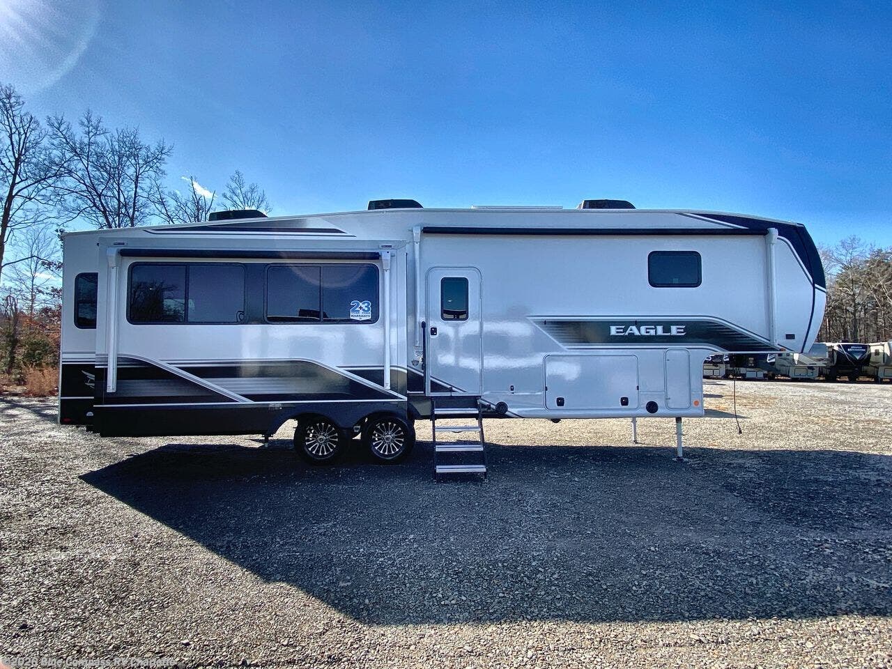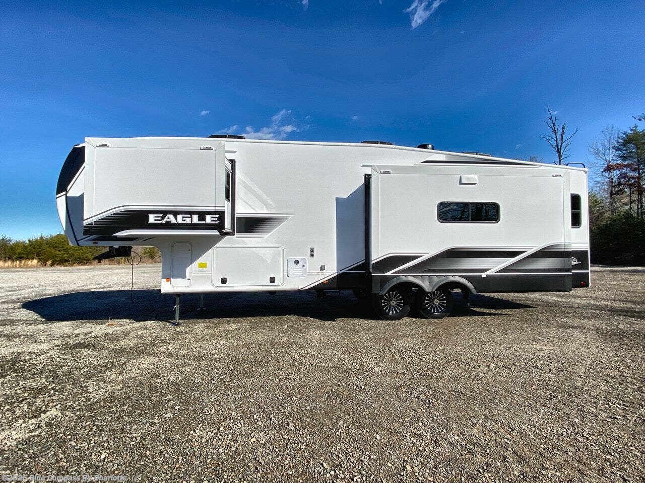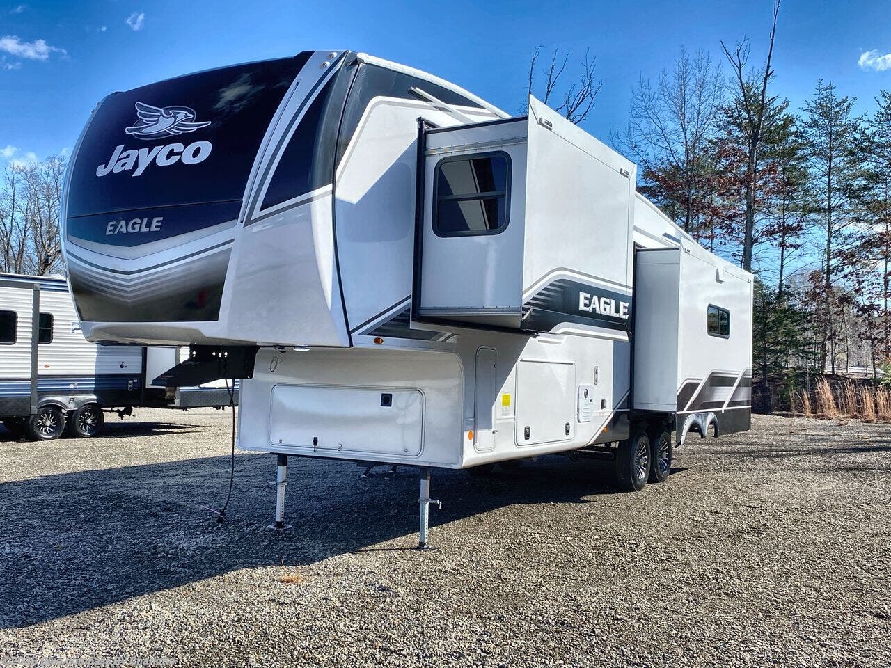 With any Eagle fifth wheel by Jayco you will appreciate durable construction materials, like the Magnum Truss Roof and the Stronghold VBL laminated walls. The JAYCOMMAND Smart RV system puts you in control of your RV's functions, and the 5 Star Handling Package will provide smooth towing from home to camp. Each model features Climate Shield zero-degree tested weather protection and the industry-exclusive HELIX cooling system that features two 15,000 BTU Whisper Quiet A/C's to keep you comfortable year around. Some of the exterior conveniences you are sure to love are the pass-through storage with Slam-Latch baggage doors and an automotive style front cap with max turn radius. The Eagle fifth wheels are designed to make you feel at home with solid hardwood slide fascia, residential vinyl flooring throughout, 100% no floor vents, and blackout roller shades with reflective side throughout for added privacy and insulation.