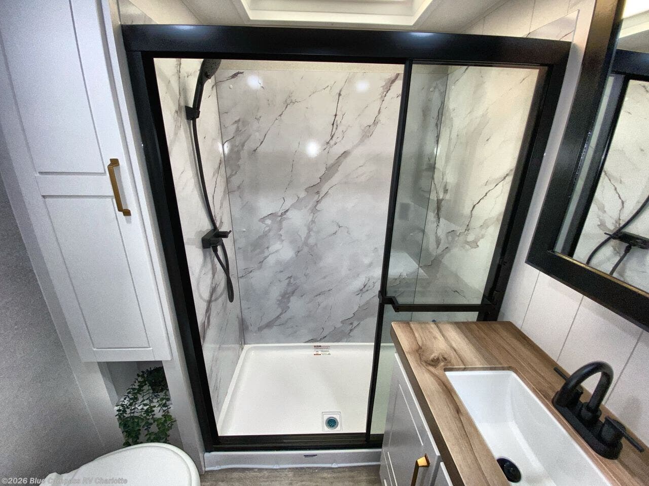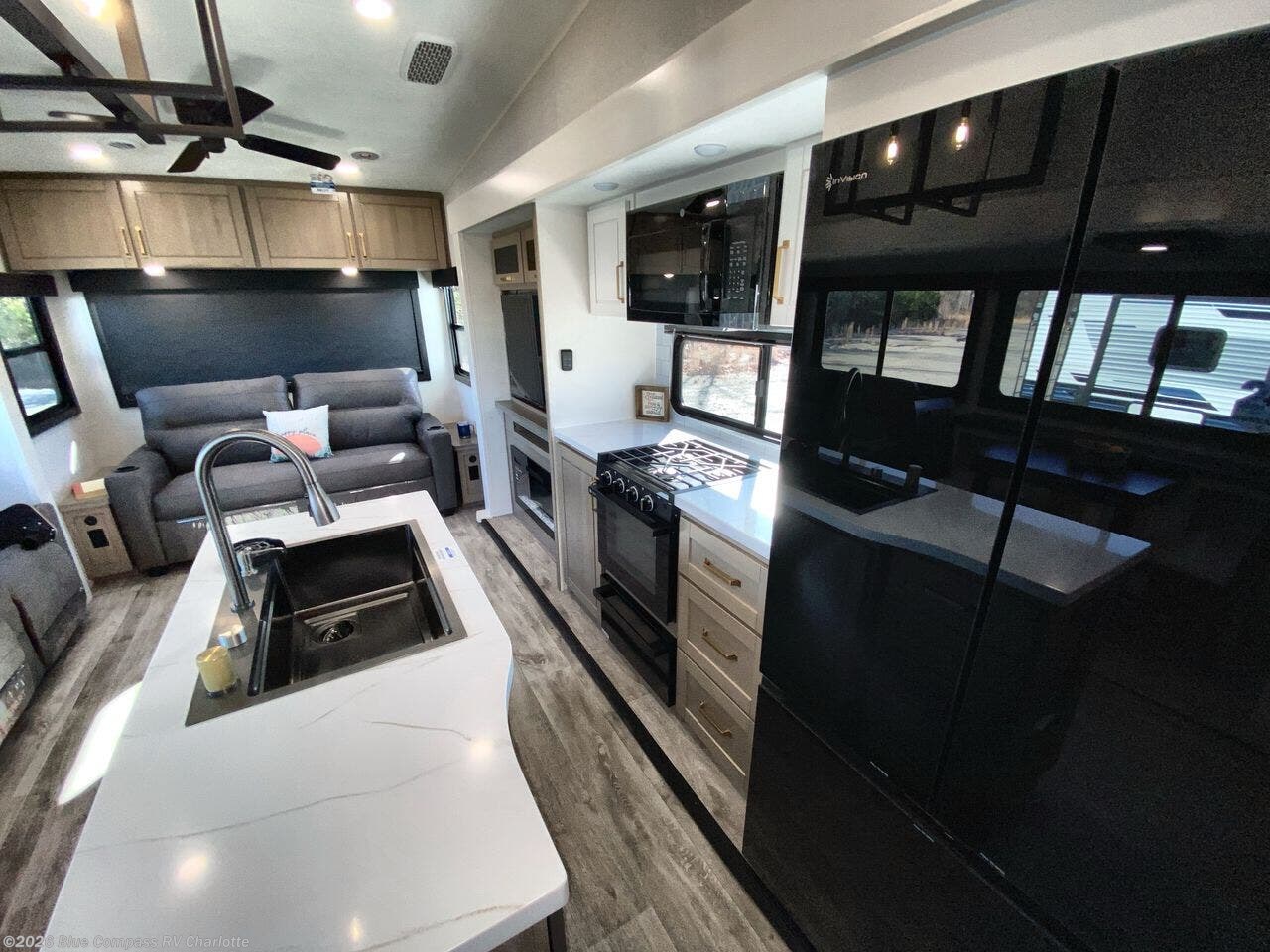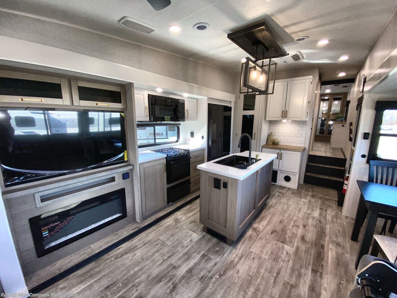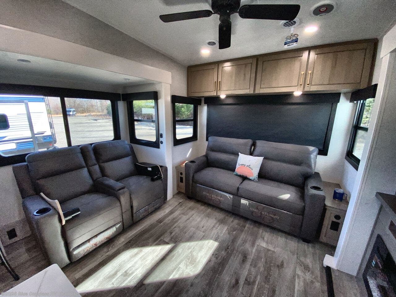 Triple slides for space, plenty of seating spaces, plus a spacious private bedroom make this fifth wheel one you won't want to pass up! You can freshen up each day in the full bath that includes a residential style glass shower door, a bathroom skylight, and a medicine cabinet to keep this space organized. Once you've cut up some fresh fruit at the kitchen island, whip up some eggs and bacon for breakfast, or just grab the cereal from the pantry. There is a spacious 16 cu. ft. 12V refrigerator, plus a hutch where you can store your own coffee machine. Relax on the tri-fold sofa, theater seat, or free-standing table with chairs/bench before heading out for the day. The king bed slide out in the front private bedroom will be waiting for you when you return!