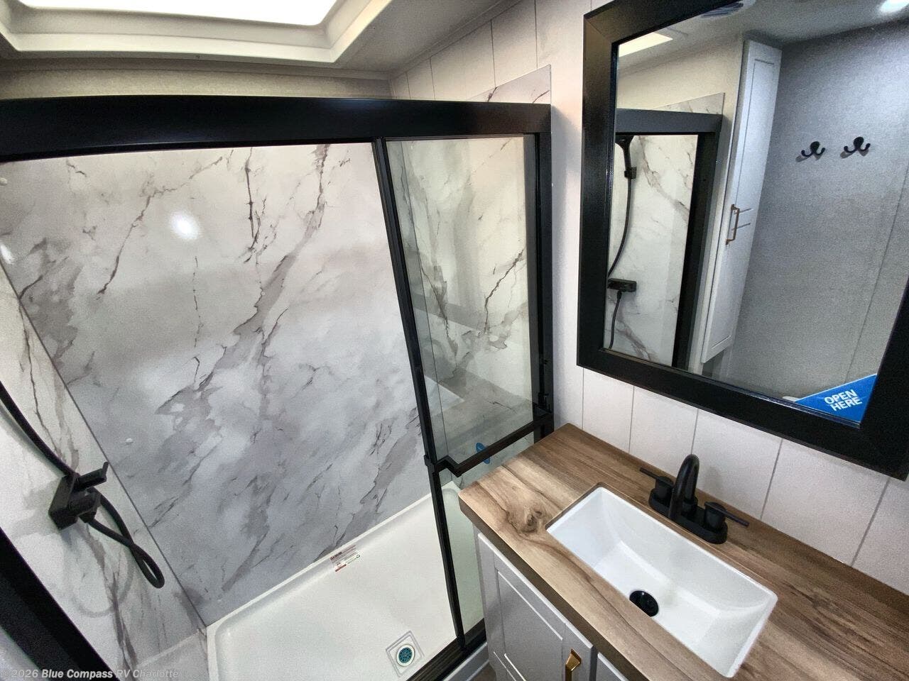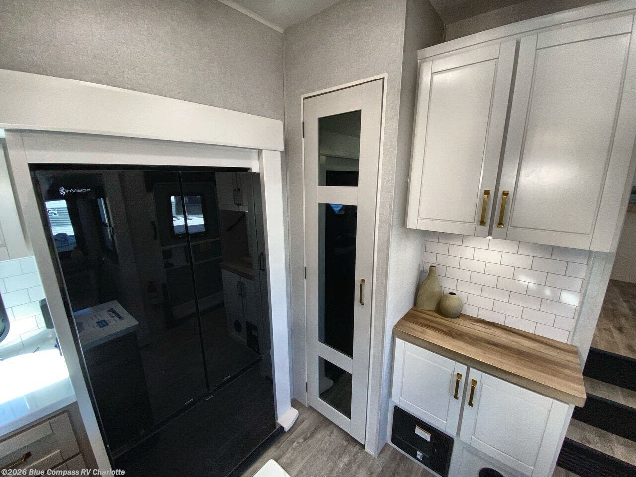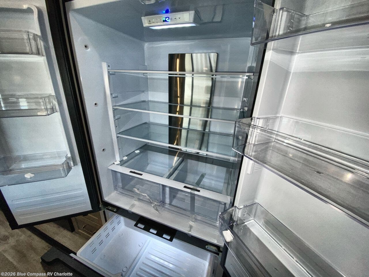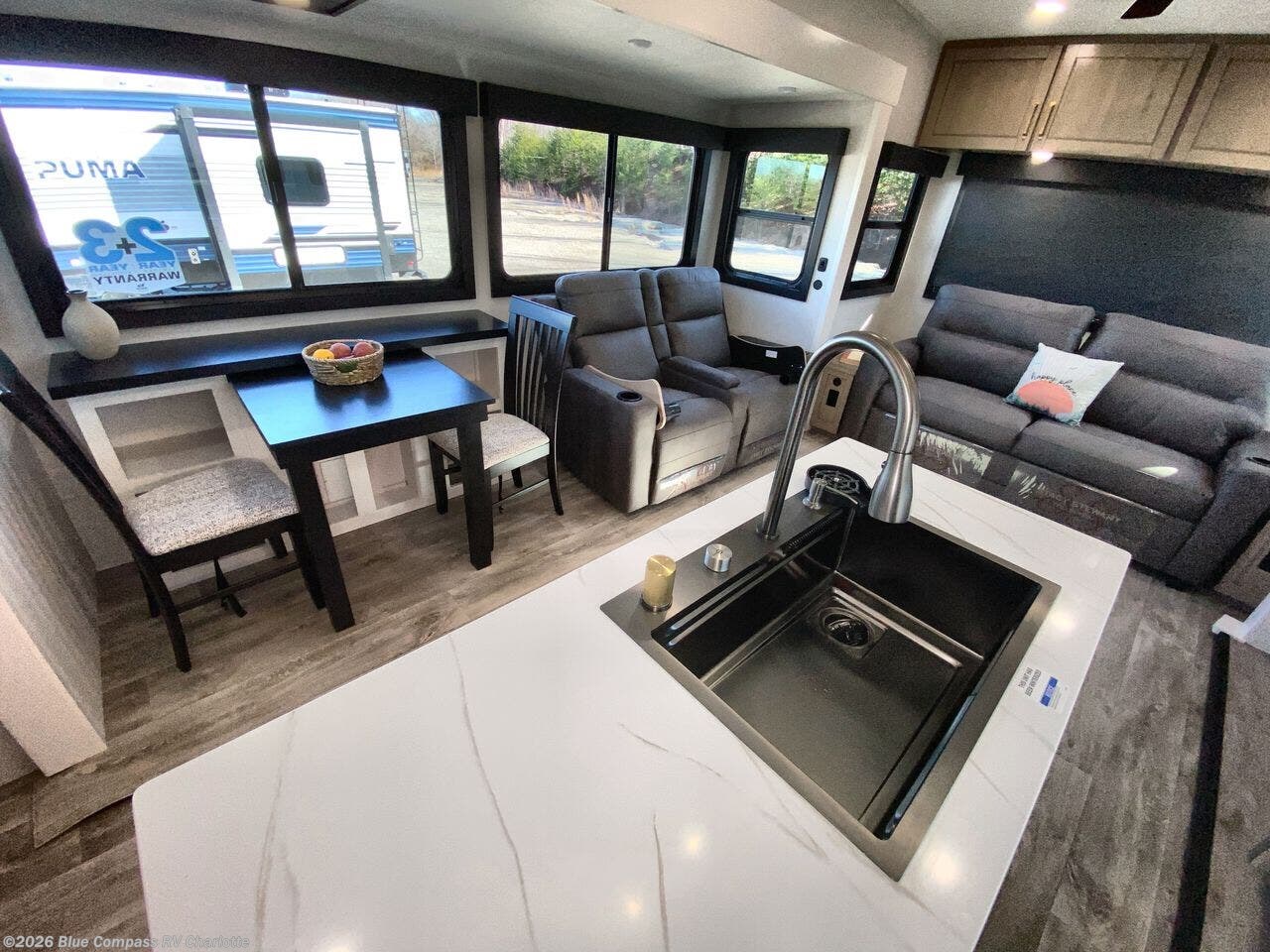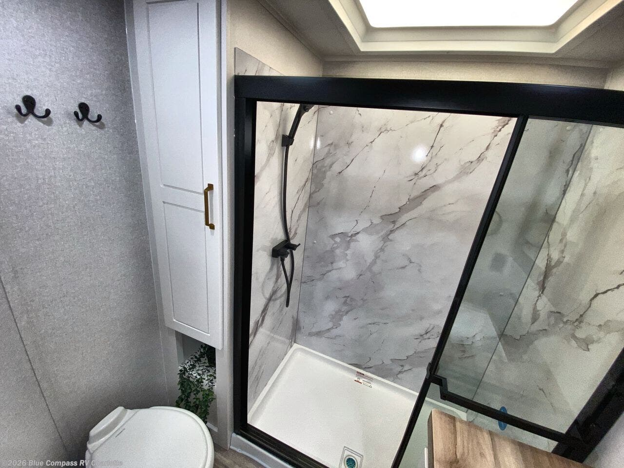 Triple slides for space, plenty of seating spaces, plus a spacious private bedroom make this fifth wheel one you won't want to pass up! You can freshen up each day in the full bath that includes a residential style glass shower door, a bathroom skylight, and a medicine cabinet to keep this space organized. Once you've cut up some fresh fruit at the kitchen island, whip up some eggs and bacon for breakfast, or just grab the cereal from the pantry. There is a spacious 16 cu. ft. 12V refrigerator, plus a hutch where you can store your own coffee machine. Relax on the tri-fold sofa, theater seat, or free-standing table with chairs/bench before heading out for the day. The king bed slide out in the front private bedroom will be waiting for you when you return!