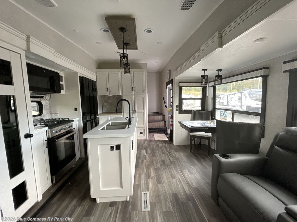 Triple slides for space, plenty of seating spaces, plus a spacious private bedroom make this fifth wheel one you won't want to pass up! You can freshen up each day in the full bath that includes a residential style glass shower door, a bathroom skylight, and a medicine cabinet to keep this space organized. Once you've cut up some fresh fruit at the kitchen island, whip up some eggs and bacon for breakfast, or just grab the cereal from the pantry. There is a spacious 16 cu. ft. 12V refrigerator, plus a hutch where you can store your own coffee machine. Relax on the tri-fold sofa, theater seat, or roll top dinette table with chairs before heading out for the day. The king bed slide out in the front private bedroom will be waiting for you when you return!