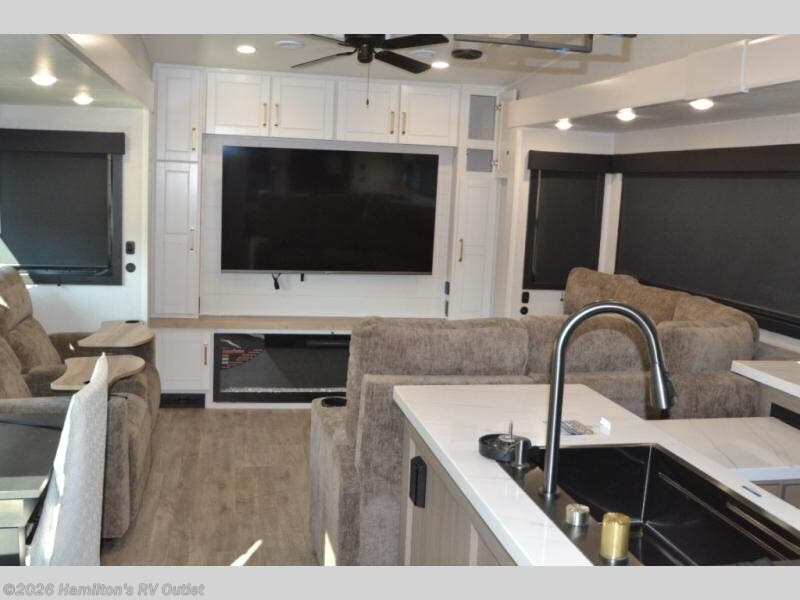 It will be so easy to enjoy time in this spacious fifth wheel! The rear living area includes an entertainment center with a fireplace across from the L-shaped sofa for movie nights. There is also a theater sofa with cup holders plus a roll-top dinette with two chairs to dine at. The chef of your group will love the generous counter space in the middle kitchen, and there is a large pantry to keep food stocked. Heading up front, you'll find the spacious bathroom that includes a shower with a seat, and the front private bedroom with a king bed slide out. There is also a chest with a TV, front shelves with drawers, plus washer and dryer prep!